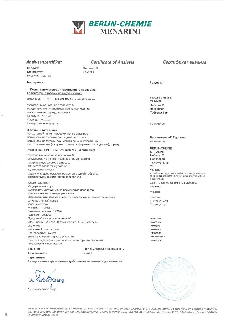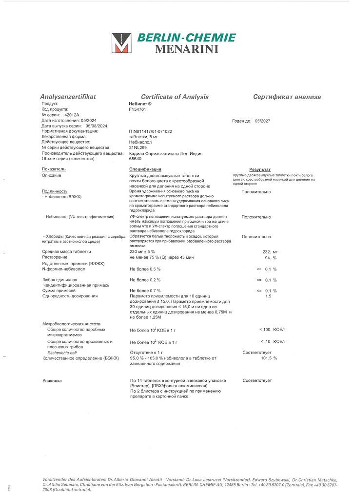 Средняя суточная доза для лечения артериальной гипертензии и ИБС составляет 2,5-5 мг (1/2-1 таб.). Небилет® можно применять в монотерапии или в сочетании с другими средствами, снижающими АД.