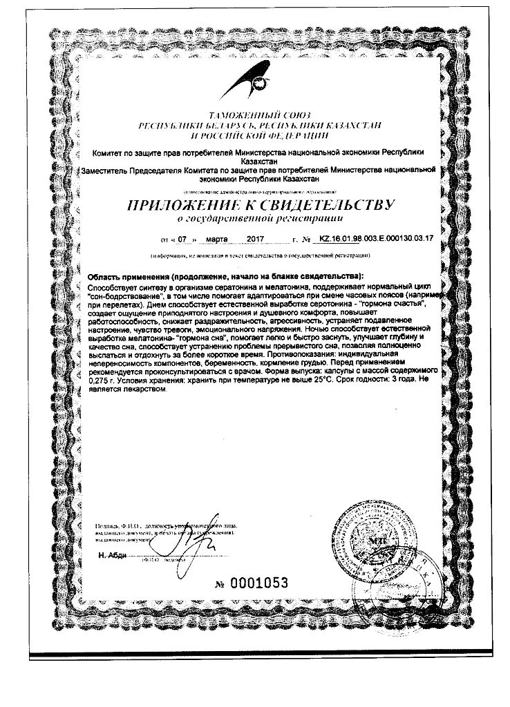 Документы Формула спокойствия Триптофан капсулы с массой содержимого 0,275 г 15 шт