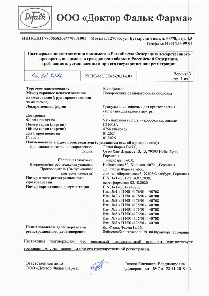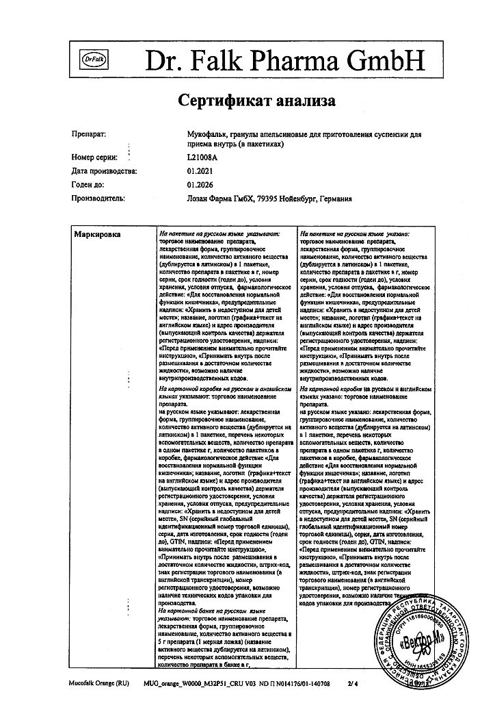 Следует соблюдать интервал в 30-60 мин между приемом Мукофалька и других препаратов.