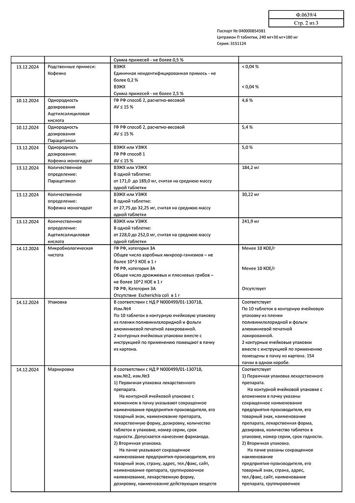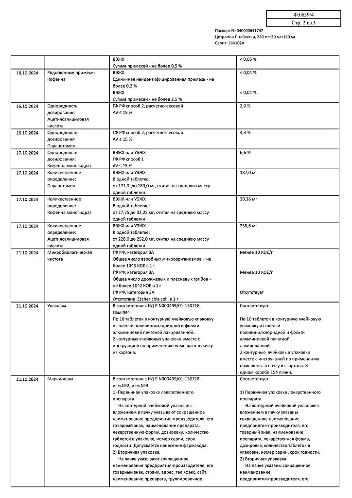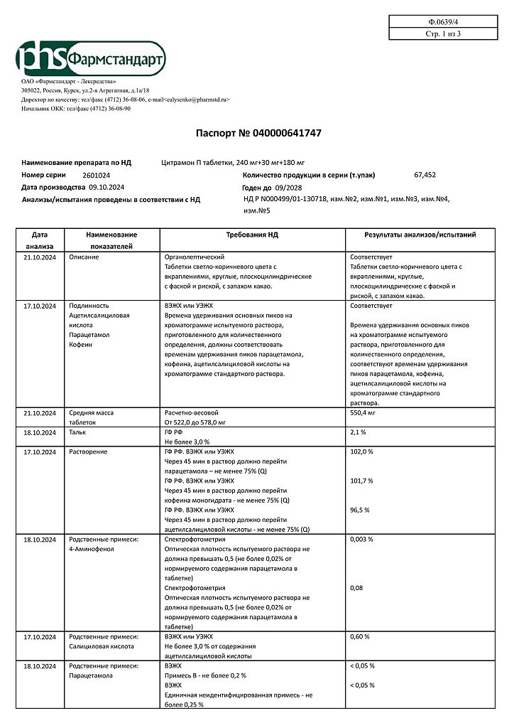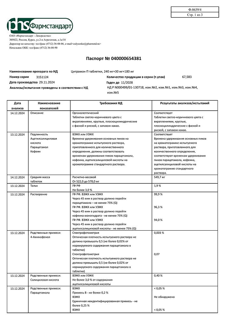 Действующее вещество: Ацетилсалициловая кислота, Кофеин, Парацетамол