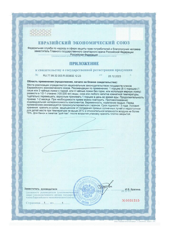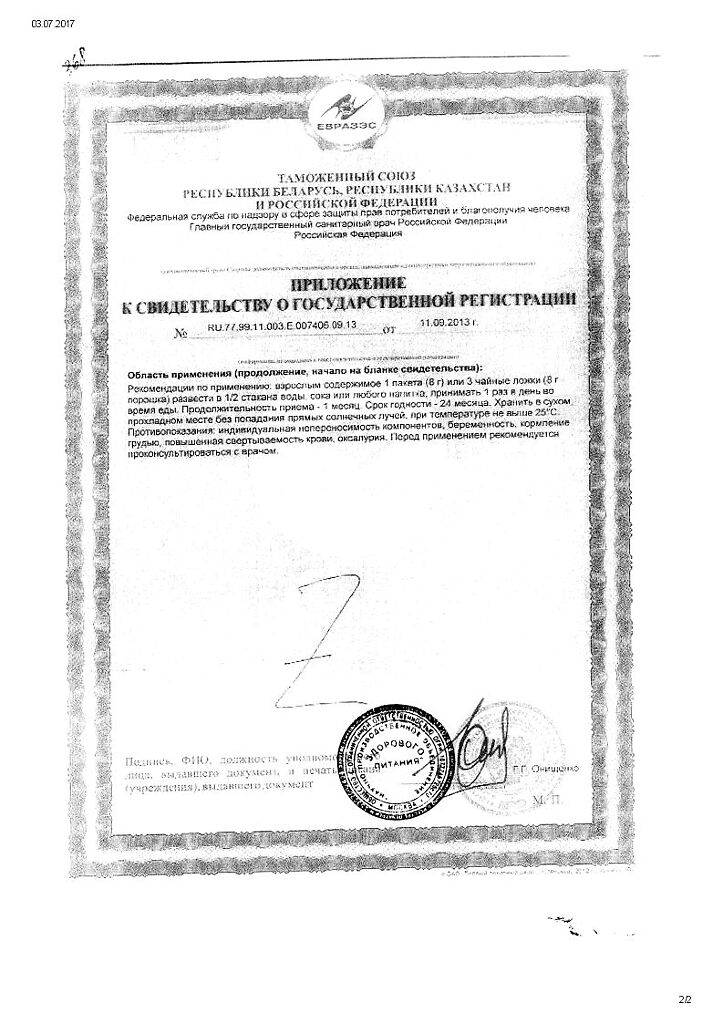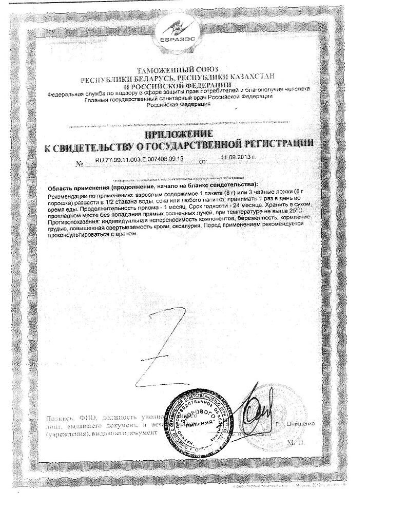 1 порцию (8 г) порошка (1 саше или 3 чайные ложки с горкой, или 4 чайные ложки без горки, или используя мерную ложку) развести в 1/2-1 стакане (100-200 мл) воды, сока или любого напитка комнатной температуры, тщательно перемешать; взрослым принимать 1 порцию в день во время еды. Продолжительность приема: 1-2 месяца. При необходимости прием можно повторить.