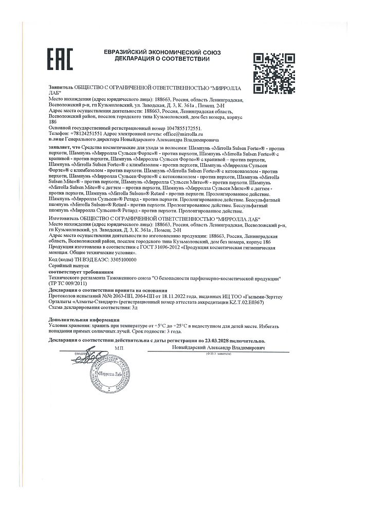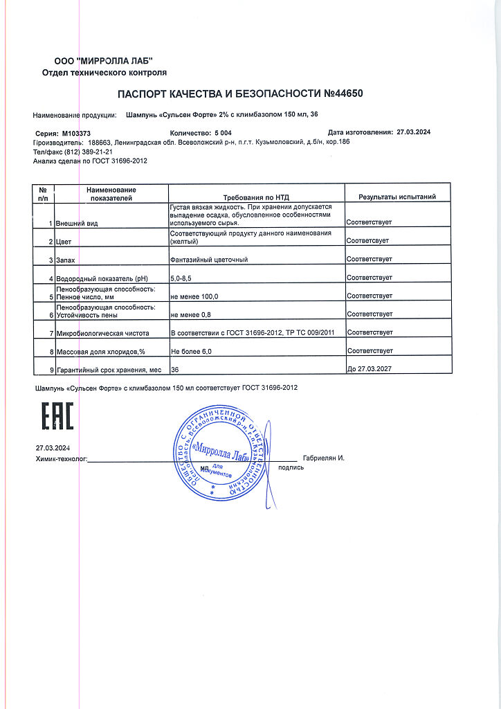 Документы Mirrolla Сульсен Форте шампунь с климбазолом 150 мл 1 шт