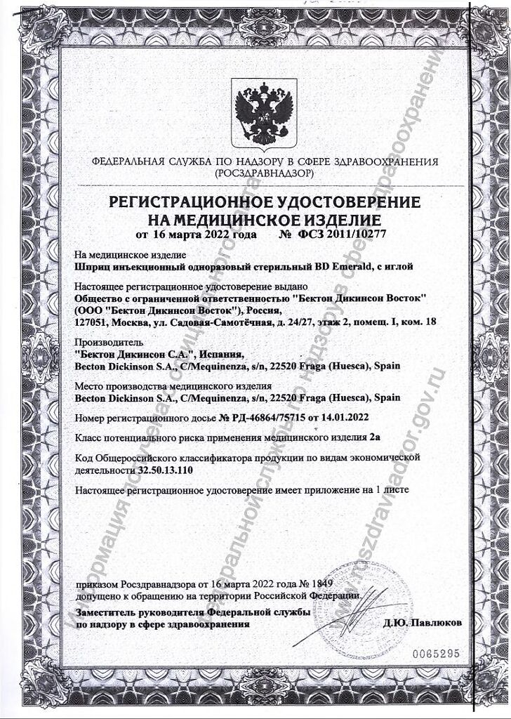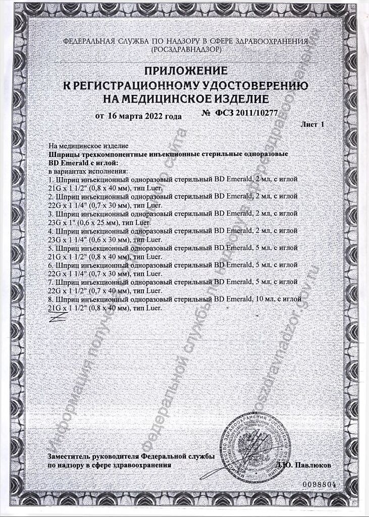 Документы Шприц 3-х компонентный Emerald 21G-0,8х40мм (зеленый) 5 мл 10 шт