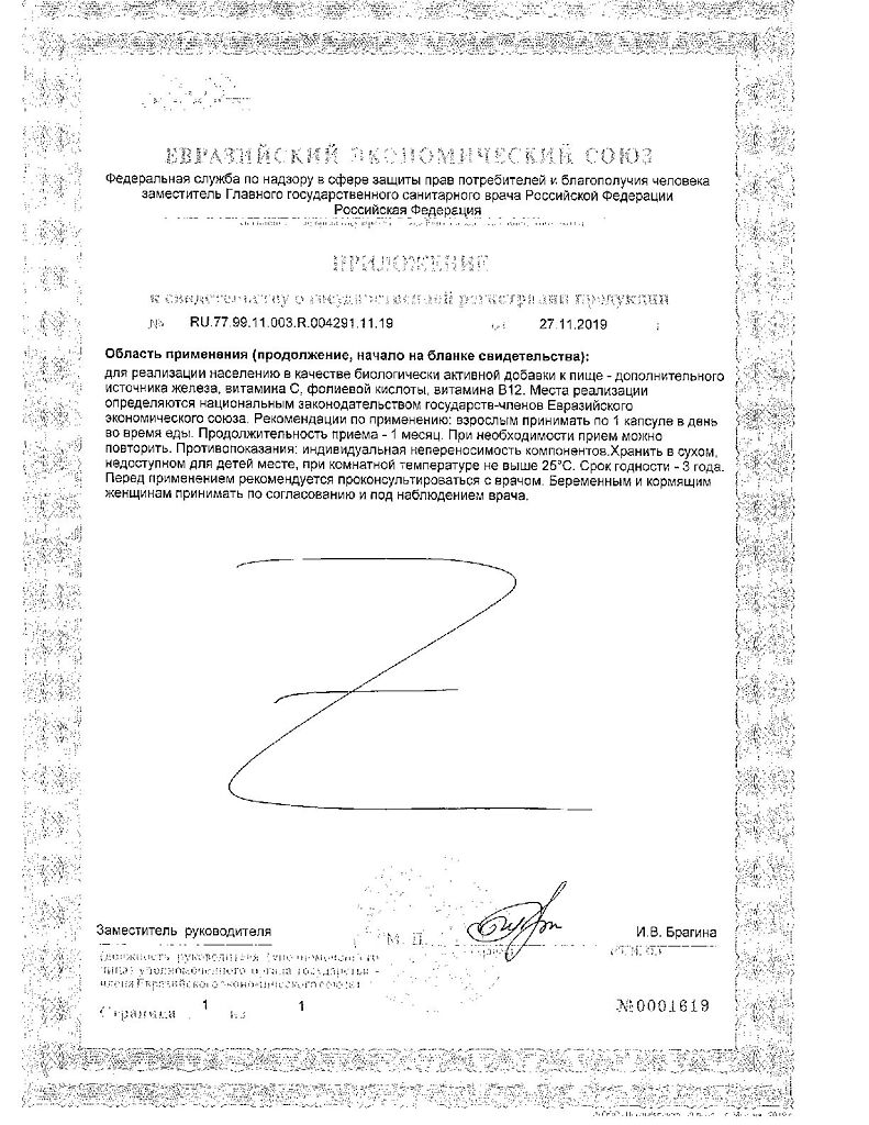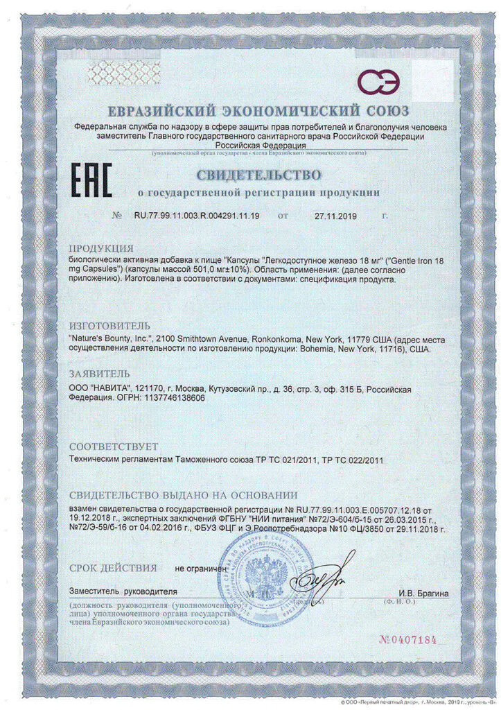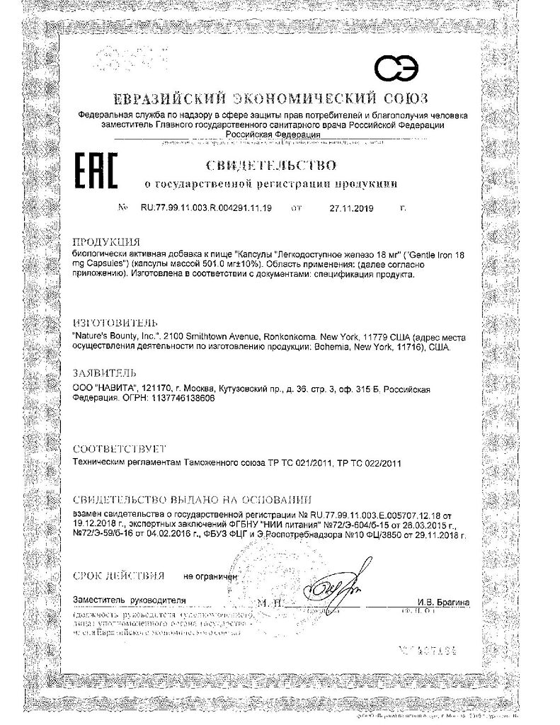 Документы Nature's Bounty Легкодоступное железо 18 мг / Gentle Iron 18 mg Capsules капсулы массой 501 мг 60 шт