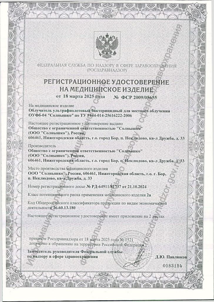 Облучатель ультрафиолетовый бактерицидный для местного облучения ОУФб-04 «Солнышко» предназначен для местных, локальных и внутриполостных облучений в эффективном спектральном диапазоне излучения 180-275 нм (УФС-диапазон) при воспалительных заболеваниях в отоларингологии, хирургии, для стерилизации воздуха в помещениях и обработки предметов бытового и медицинского назначения в лечебных, лечебно-профилактических, санаторно-курортных учреждениях, а также в домашних условиях.