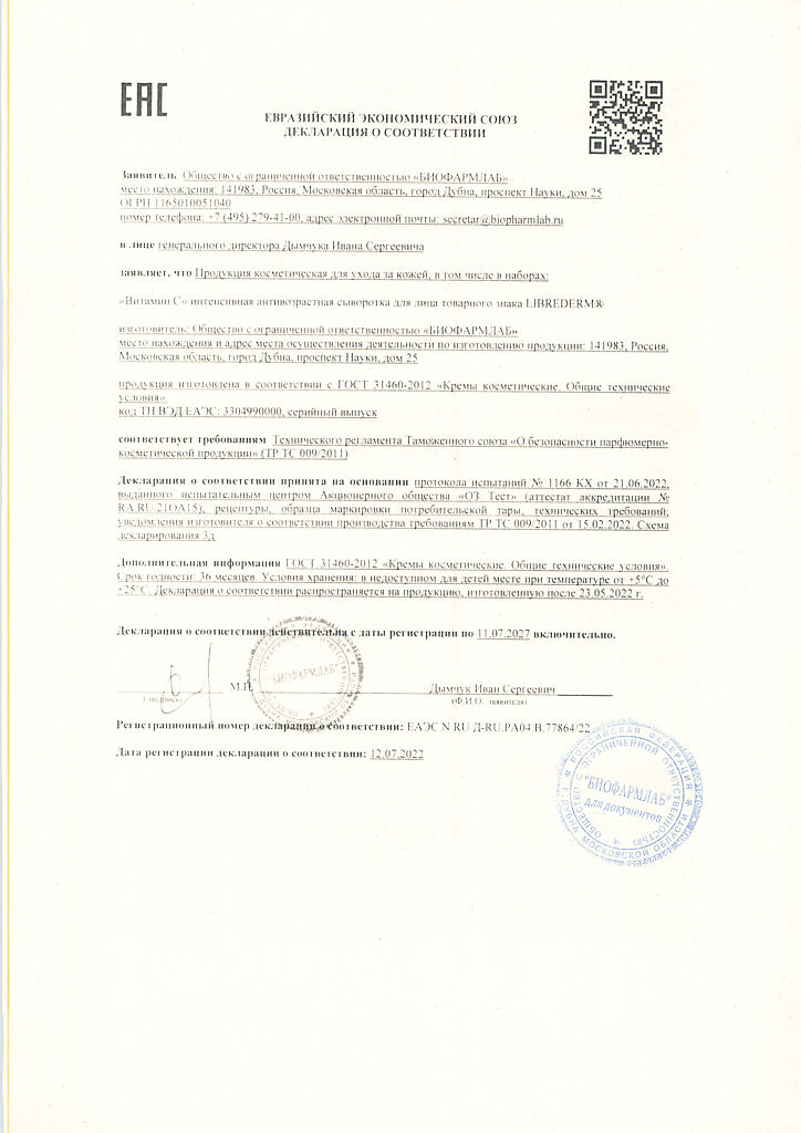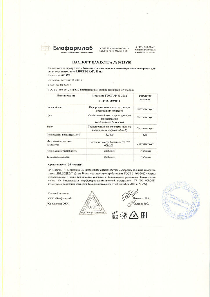 Сыворотка интенсивная антивозрастная для лица Dermatology Витамин С Librederm отличается высокой проницаемостью в кожу. Она действует сразу в нескольких направлениях: