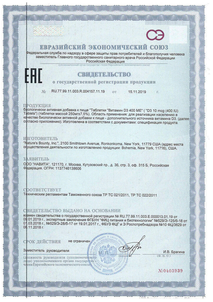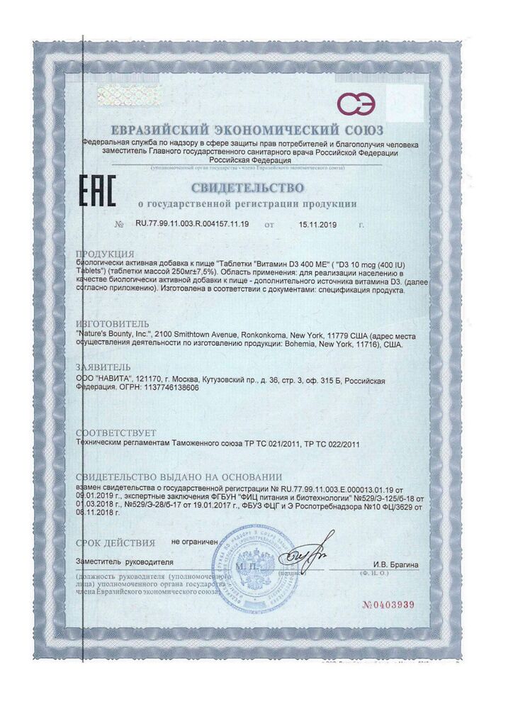 Документы Nature's Bounty Витамин D3 400 МЕ / D3 10 mcg (400 IU) Tablets таблетки массой 250 мг 100 шт