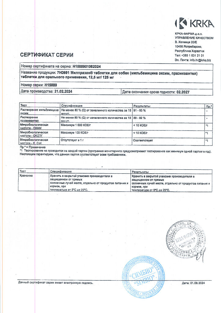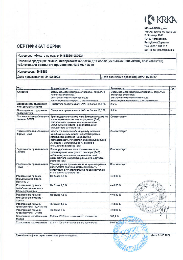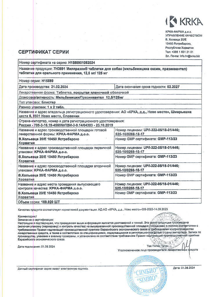 Документы Милпразон антигельминтик таблетки для собак более 5 кг 12,5 мг/125 мг 2 шт