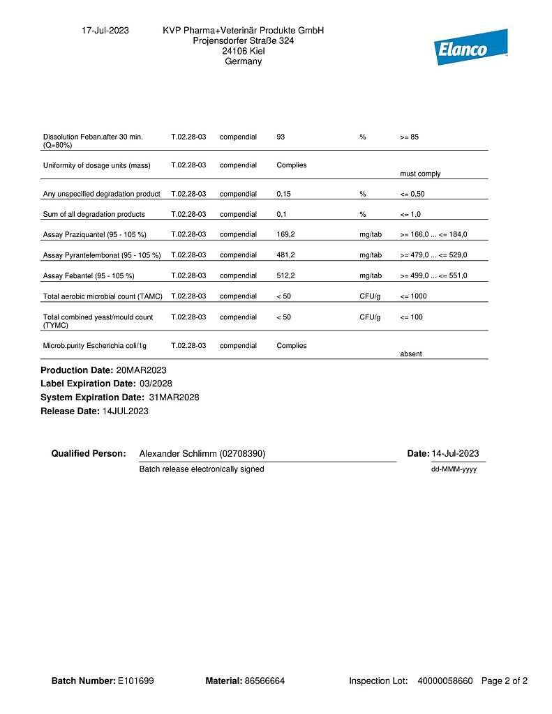 Механизм действия фебантела, входящего в состав лекарственного препарата, основан на нарушении транспорта глюкозы и микротубулярной функции паразита, ингибировании фумаратредуктазы и синтеза АТФ, повышении проницаемости клеточных мембран, что приводит к нарушению мышечной иннервации, параличу, гибели паразита и способствует его элиминации из желудочно-кишечного тракта. Пирантела эмбонат оказывает выраженное нематодоцидное действие, вызывая повышение проницаемости клеточных мембран, необратимый паралич и контрактуру мышц у нематод, что приводит к гибели паразита и способствует его элиминации из желудочно-кишечного тракта.
