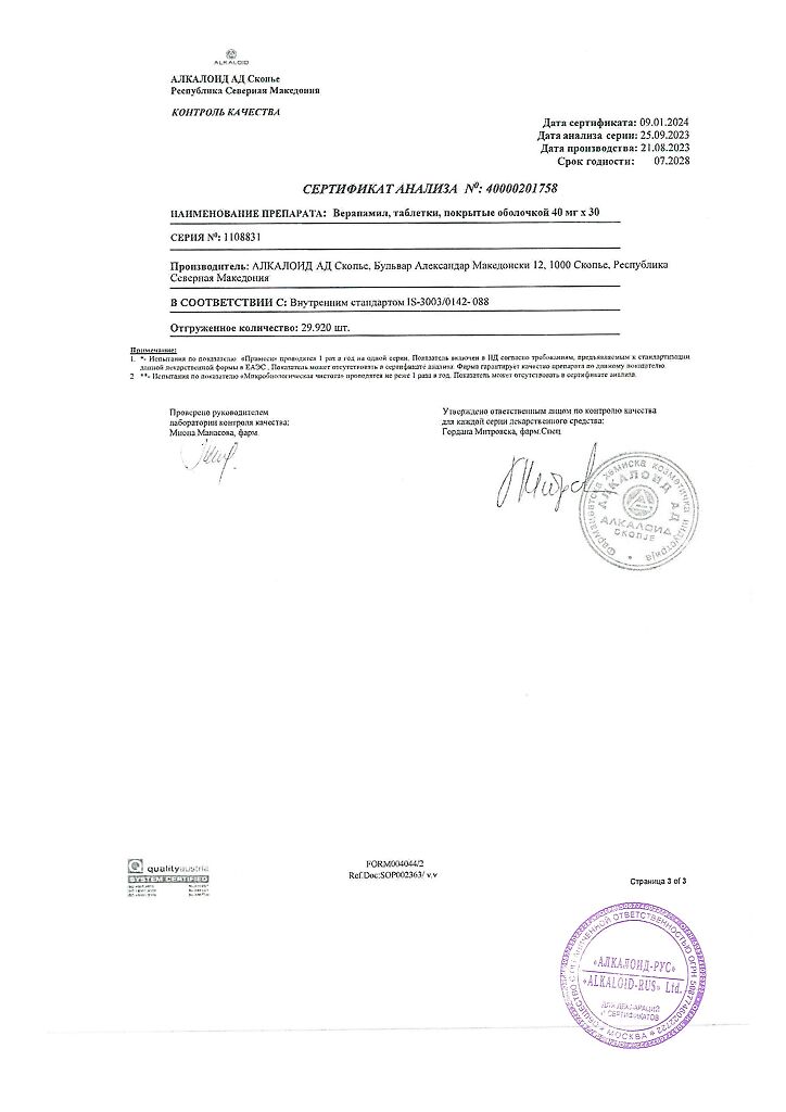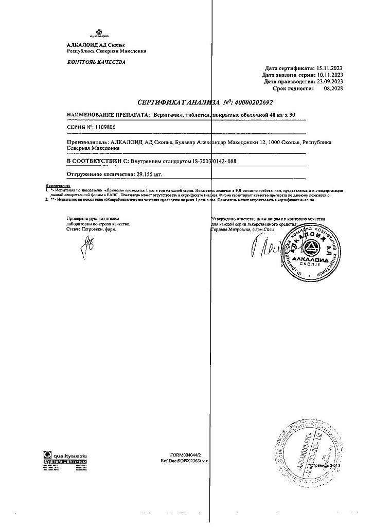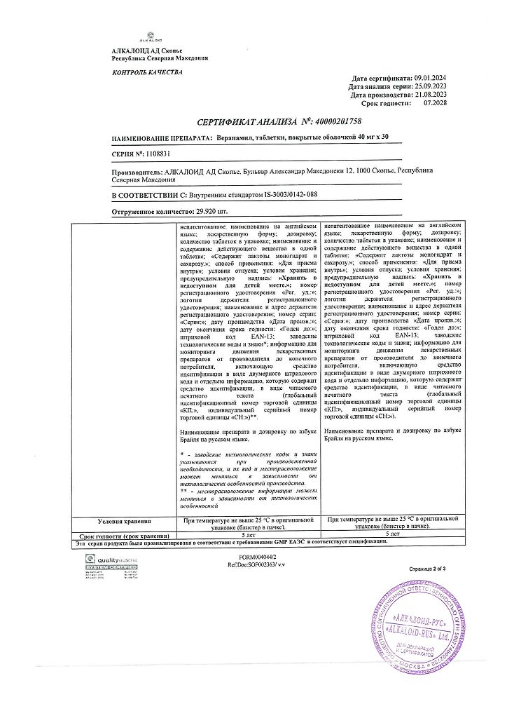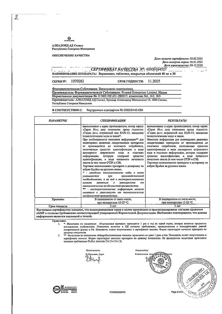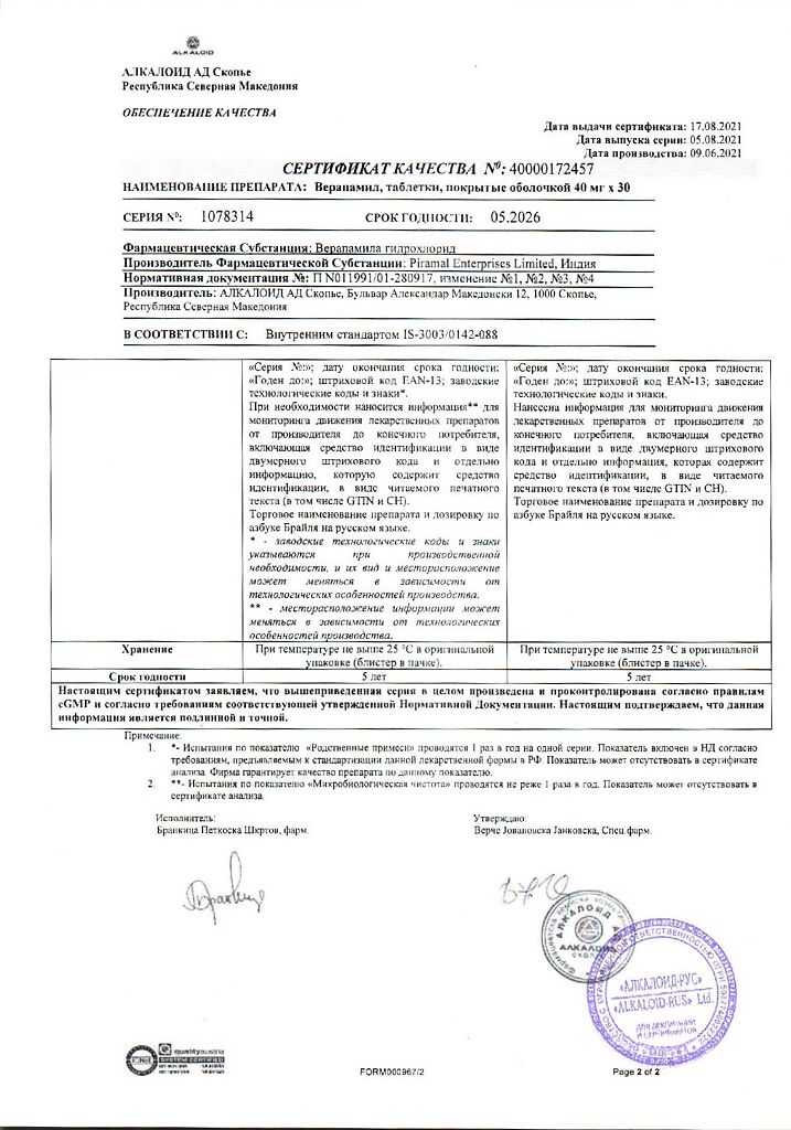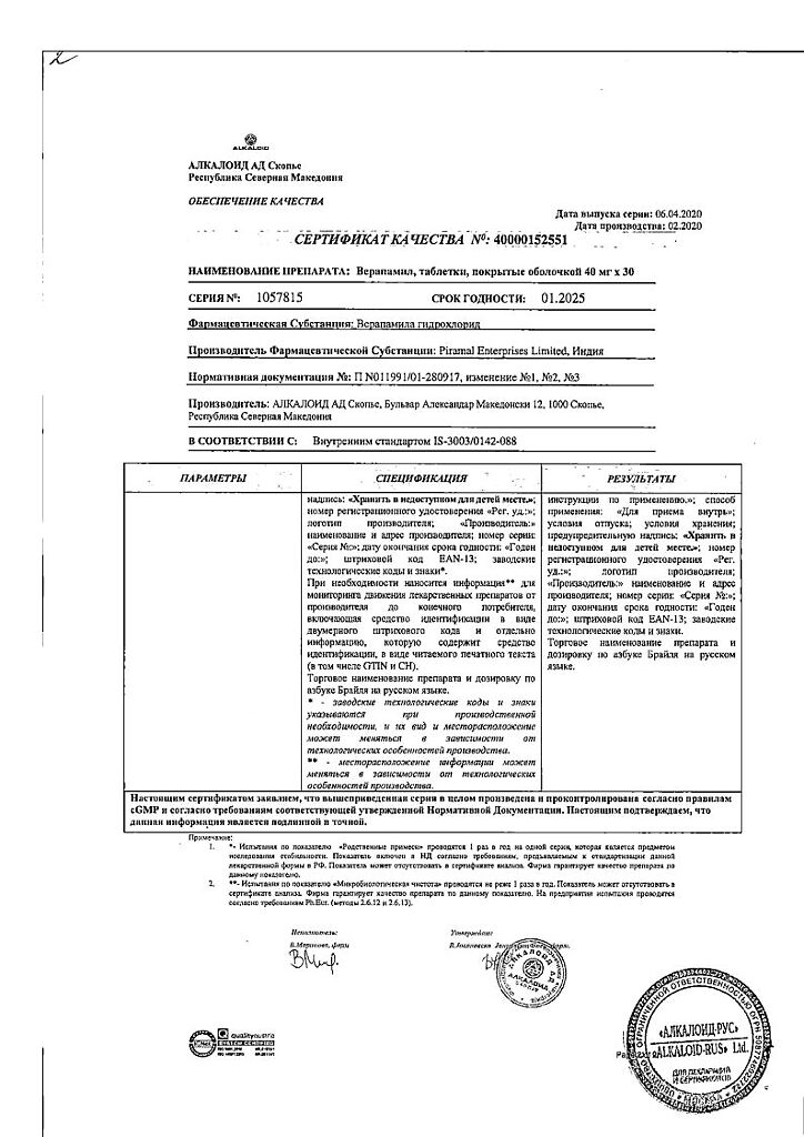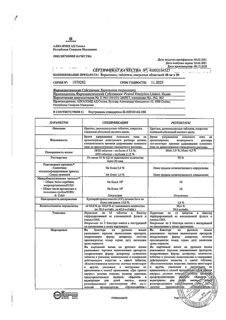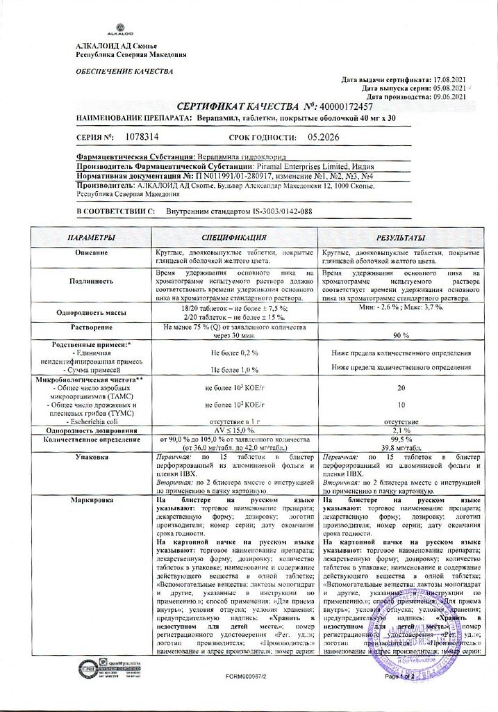 Документы Верапамил таблетки покрыт.об. 40 мг 30 шт