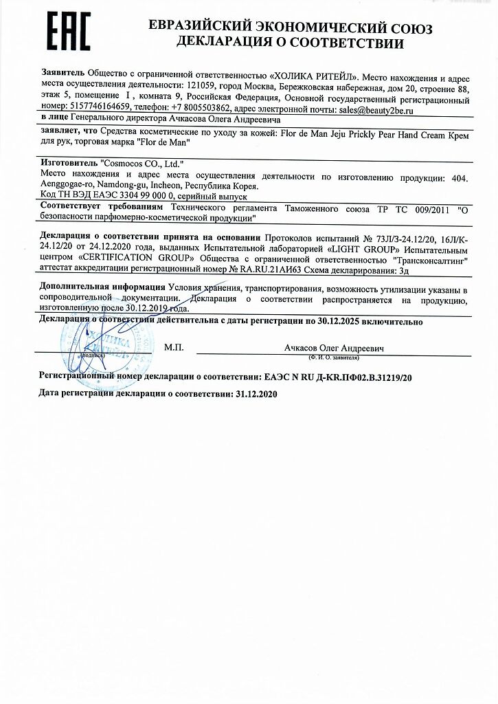 Документы Flor de Man Крем для рук с кактусом увлажняющий Jeju Prickly Pear Hand Cream 80 мл 1 шт