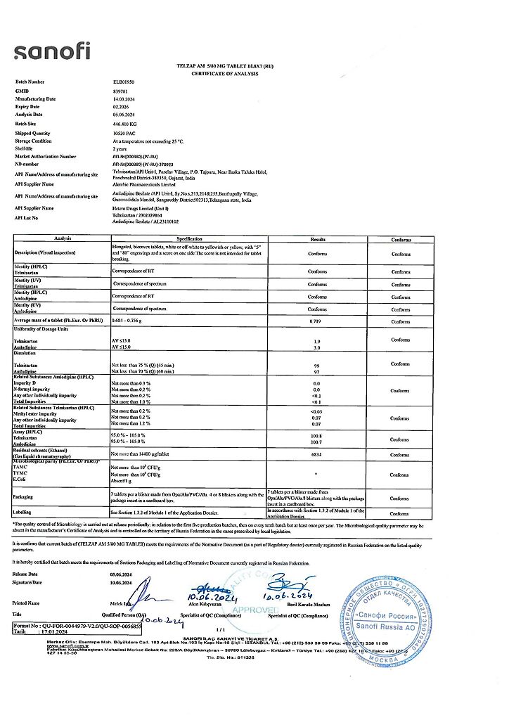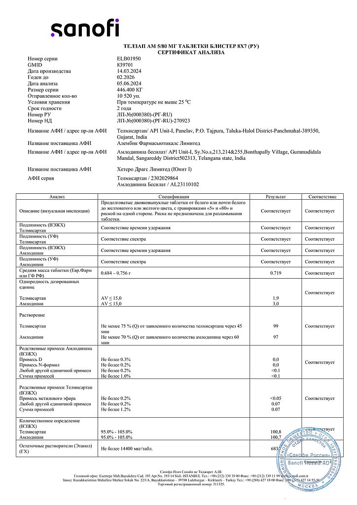 Производитель: Санофи Илач Санайи ве Тиджарет А.Ш., Турция
