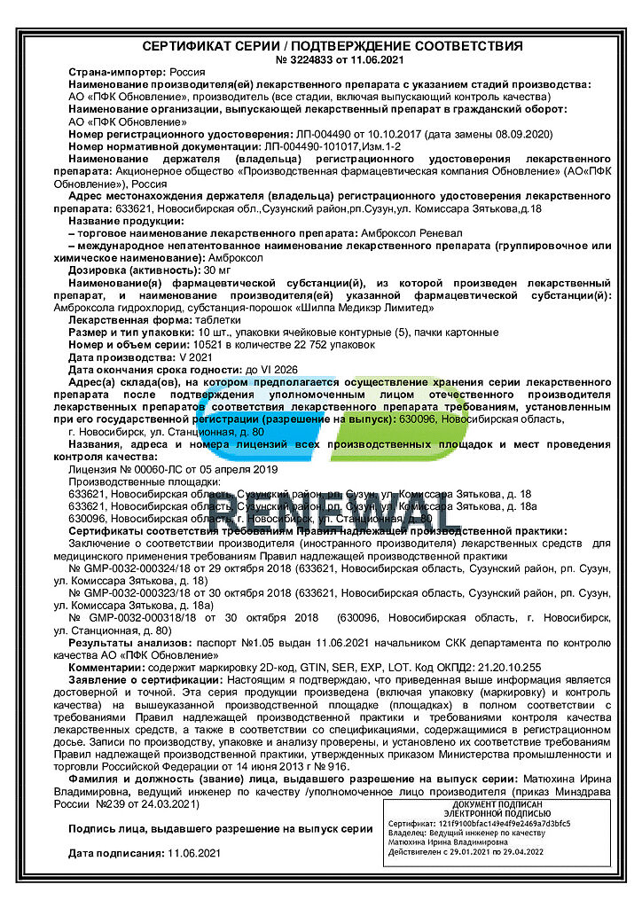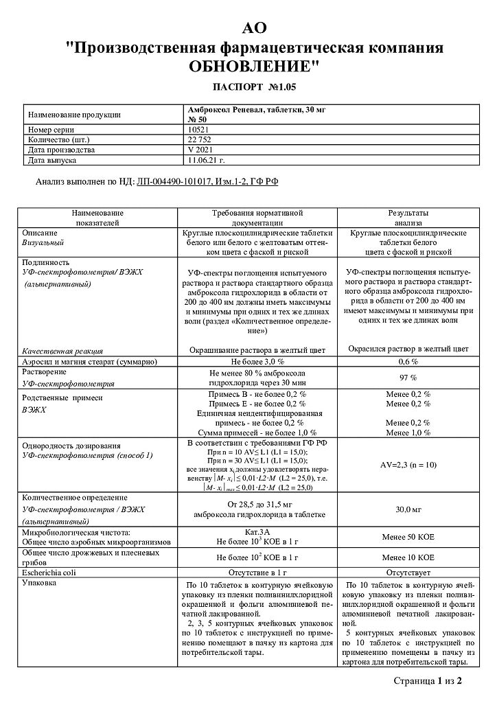 Документы Амброксол Реневал таблетки 30 мг 50 шт
