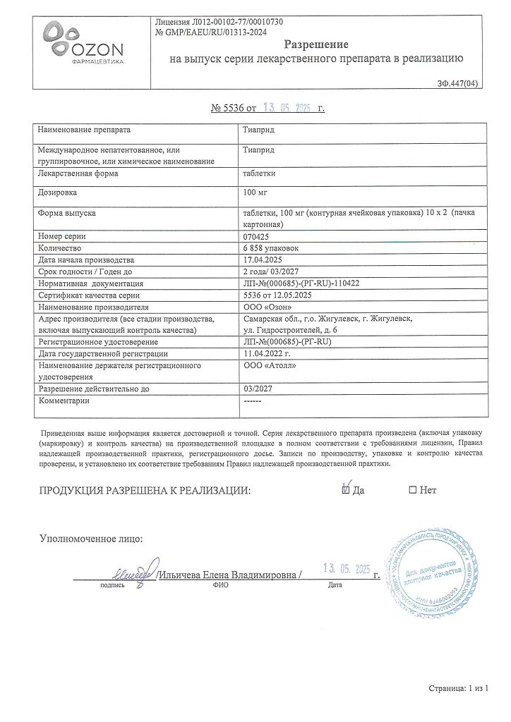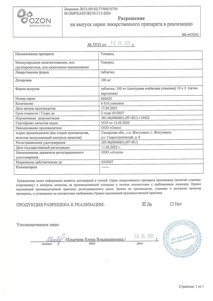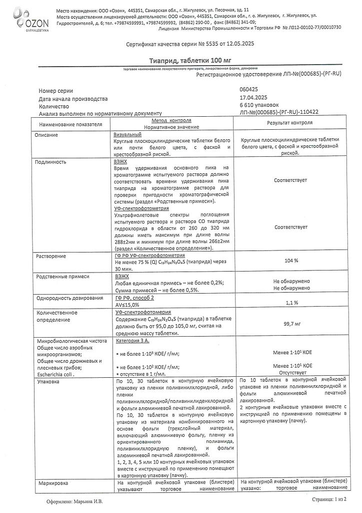 Действующее вещество: Тиаприд