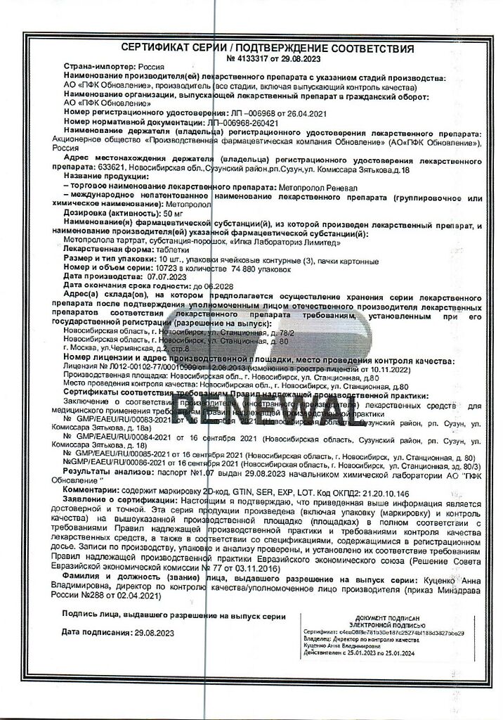 У пациентов, принимающих b-адреноблокаторы, анафилактический шок протекает в более тяжелой форме. Применение эпинефрина (адреналина) в терапевтических дозах не всегда приводит к достижению желаемого клинического эффекта на фоне приема метопролола. Пациентам с феохромоцитомой одновременно с метопрололом следует назначать α-адреноблокатор. Резкая отмена b-адреноблокаторов опасна, особенно у пациентов группы высокого риска, в связи с чем ее следует избегать. При необходимости отмены препарата ее следует производить постепенно, в течение, по крайней мере, двух недель, с двукратным снижением дозы препарата на каждом этапе, до достижения конечной дозы 12,5 мг (возможно применение метопролола в другой лекарственной форме: таблетки с пролонгированным высвобождением, покрытые пленочной оболочкой, по 25 мг с риской), которую следует принимать как минимум 4 дня до полной отмены препарата. При появлении симптомов (например, усиление симптомов стенокардии, повышение АД) рекомендуется более медленный режим отмены препарата. Резкая отмена b-адреноблокатора может привести к утяжелению течения хронической сердечной недостаточности и повышению риска инфаркта миокарда и внезапной смерти.