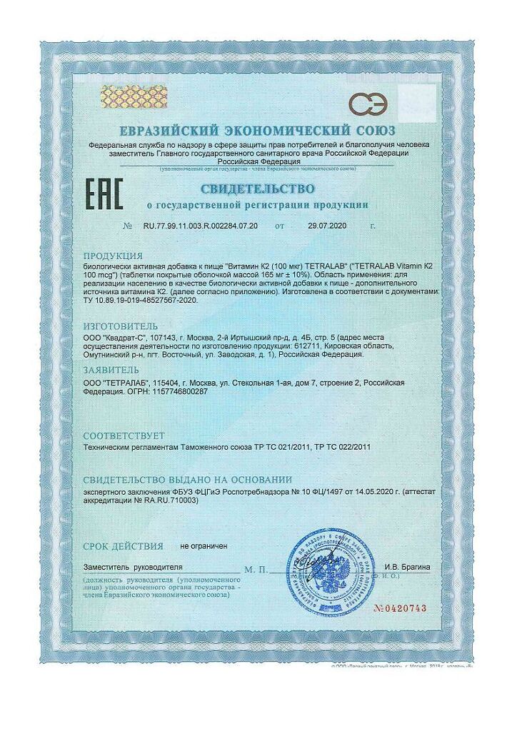 Документы Tetralab Витамин K2 100 мкг/Vitamin K2 100 mg таблетки покрыт.об. массой 165 мг 60 шт