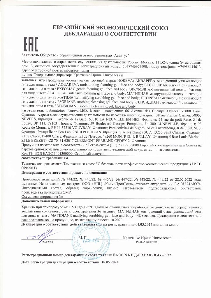 Документы Noreva Exfoliac Мягкий очищающий гель для лица и тела 200 мл 1 шт