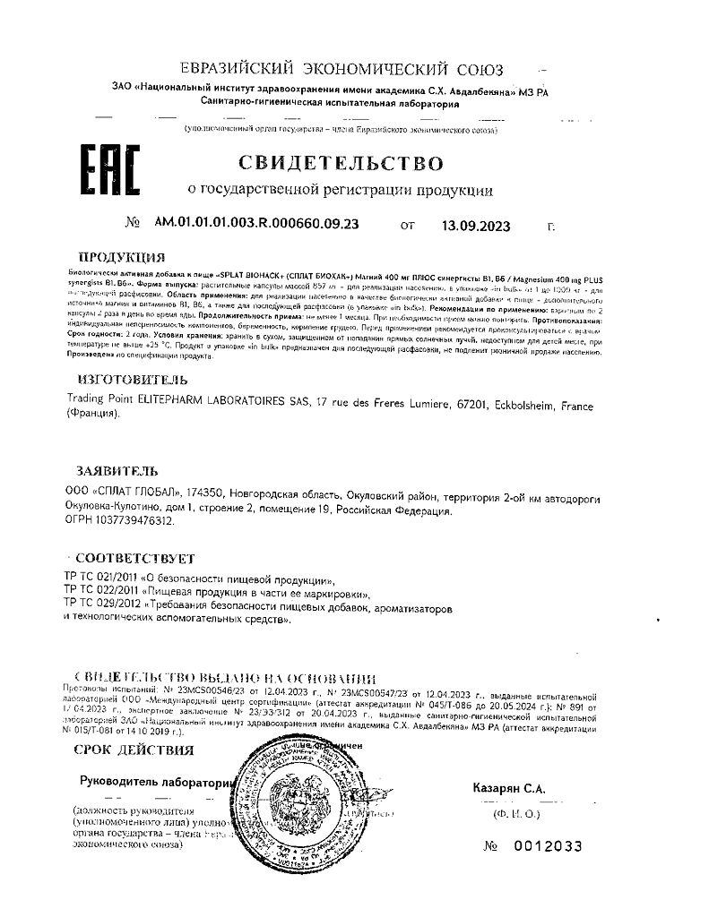 Документы Сплат (Splat) Биохак+ Магний 400 мг плюс синергисты В1,В6 капсулы массой 857 мг 60 шт