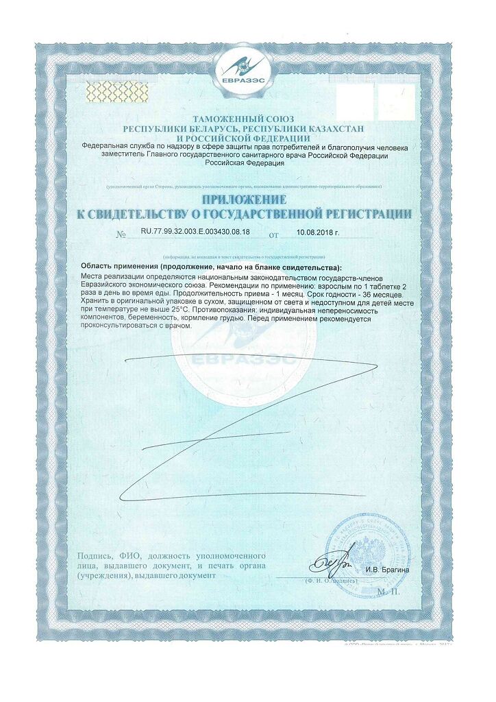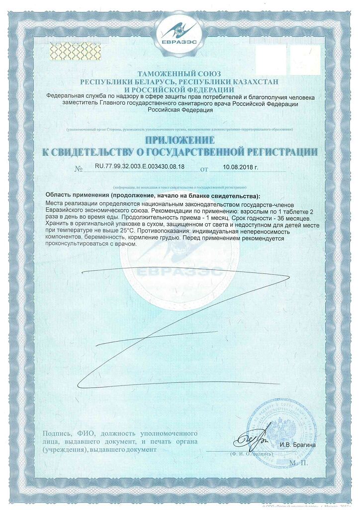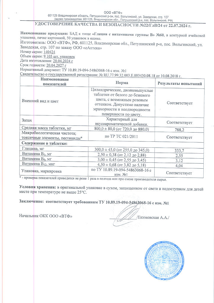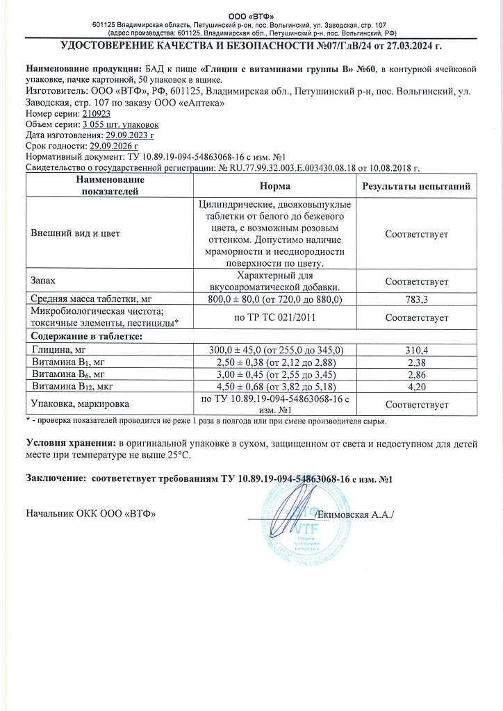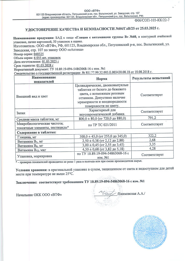 Область применения: рекомендуется в качестве биологически активной добавки к пище — дополнительного источника глицина, витаминов группы В (В1, В6, В12).