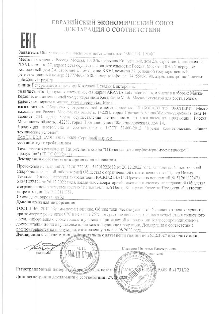 Документы Aravia Laboratories Маска-активатор для роста волос с кайенским перцем и маслом усьмы Spicy Hair Mask 200 мл 1 шт