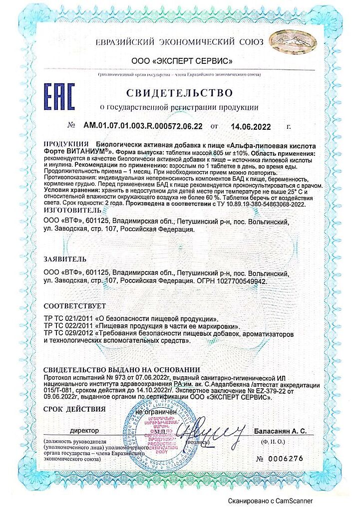 Документы Витаниум Альфа-липоевая кислота Форте таблетки массой 805 мг 30 шт