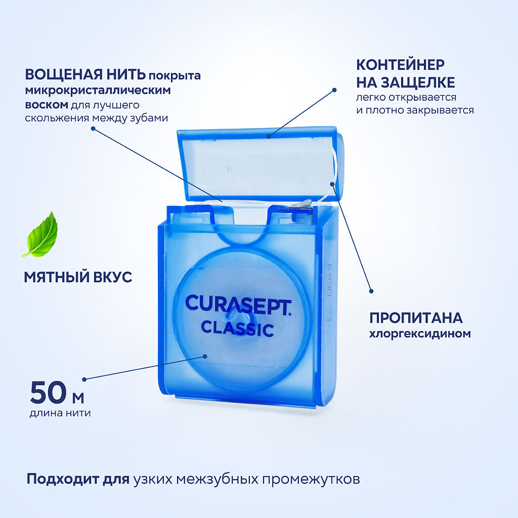 • 📒 Подробная инструкция по применению Curasept Classico Зубная нить вощеная CHX 0,2% со вкусом мяты 50м 1 шт