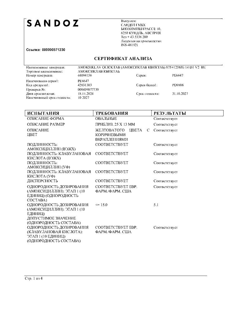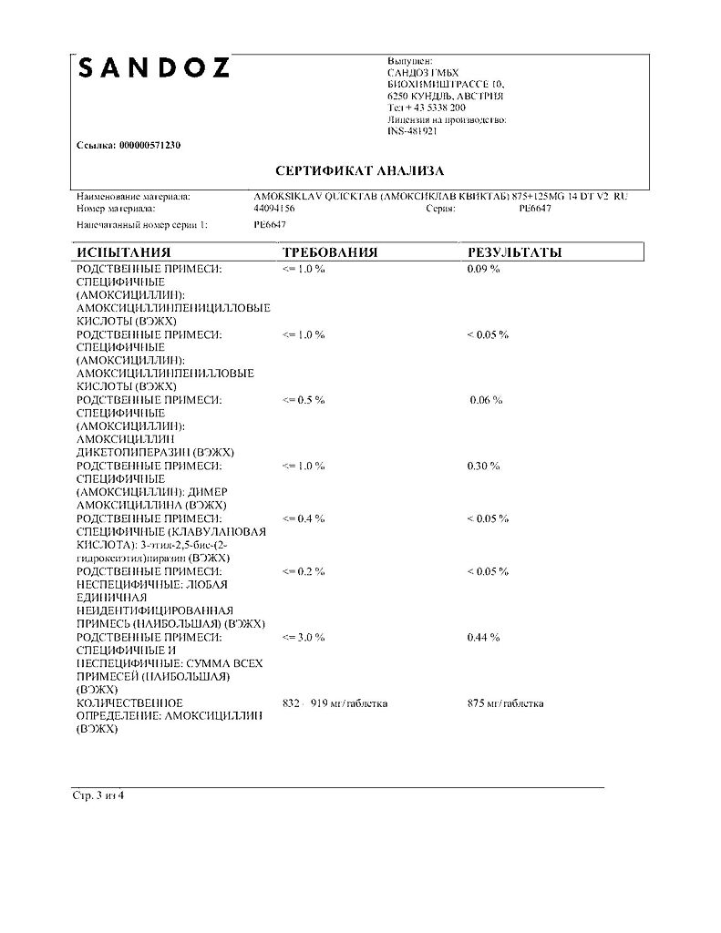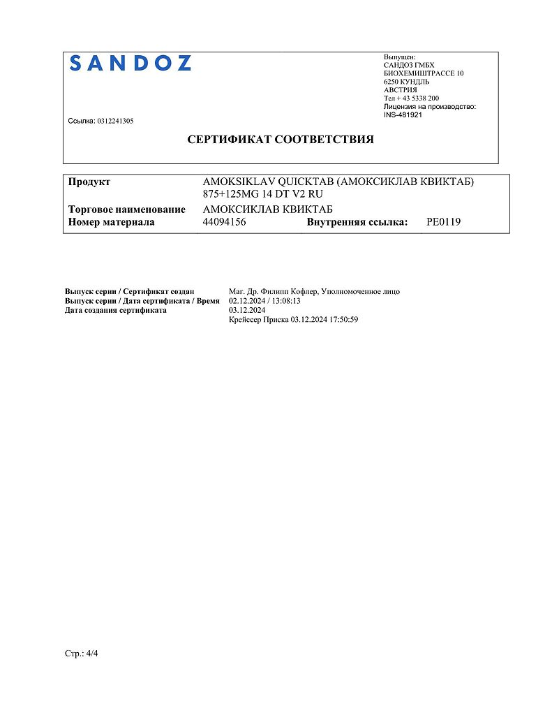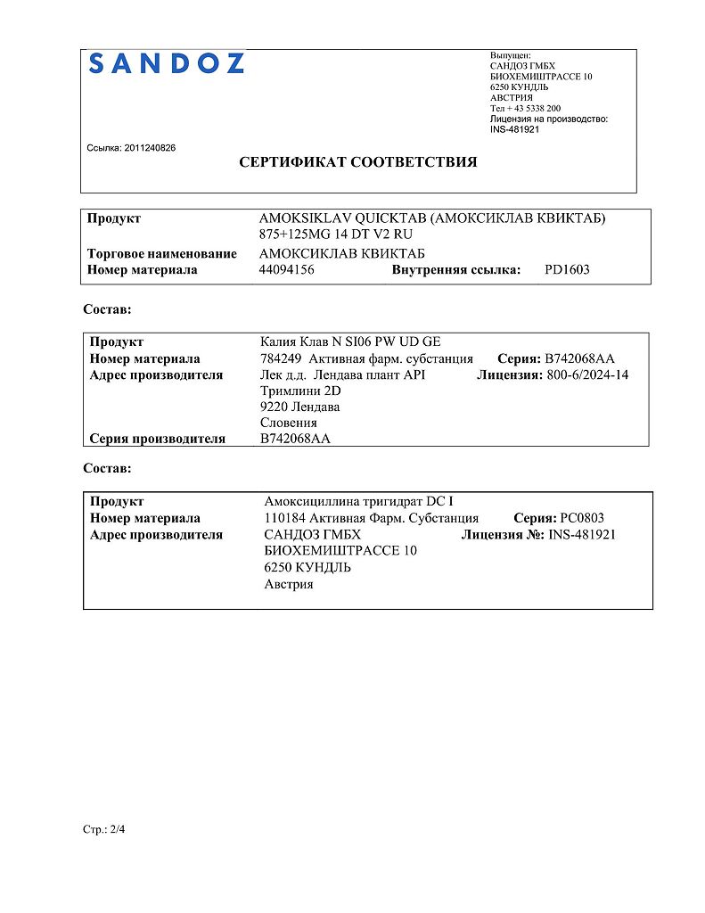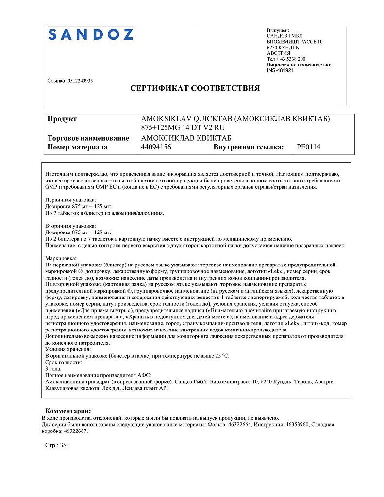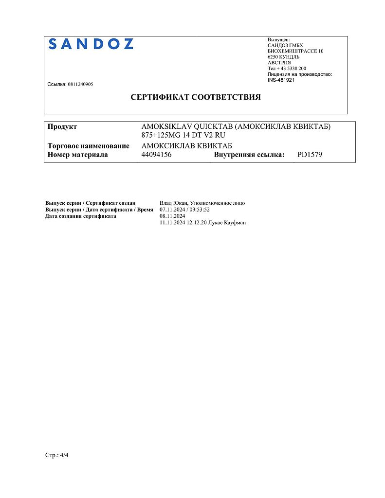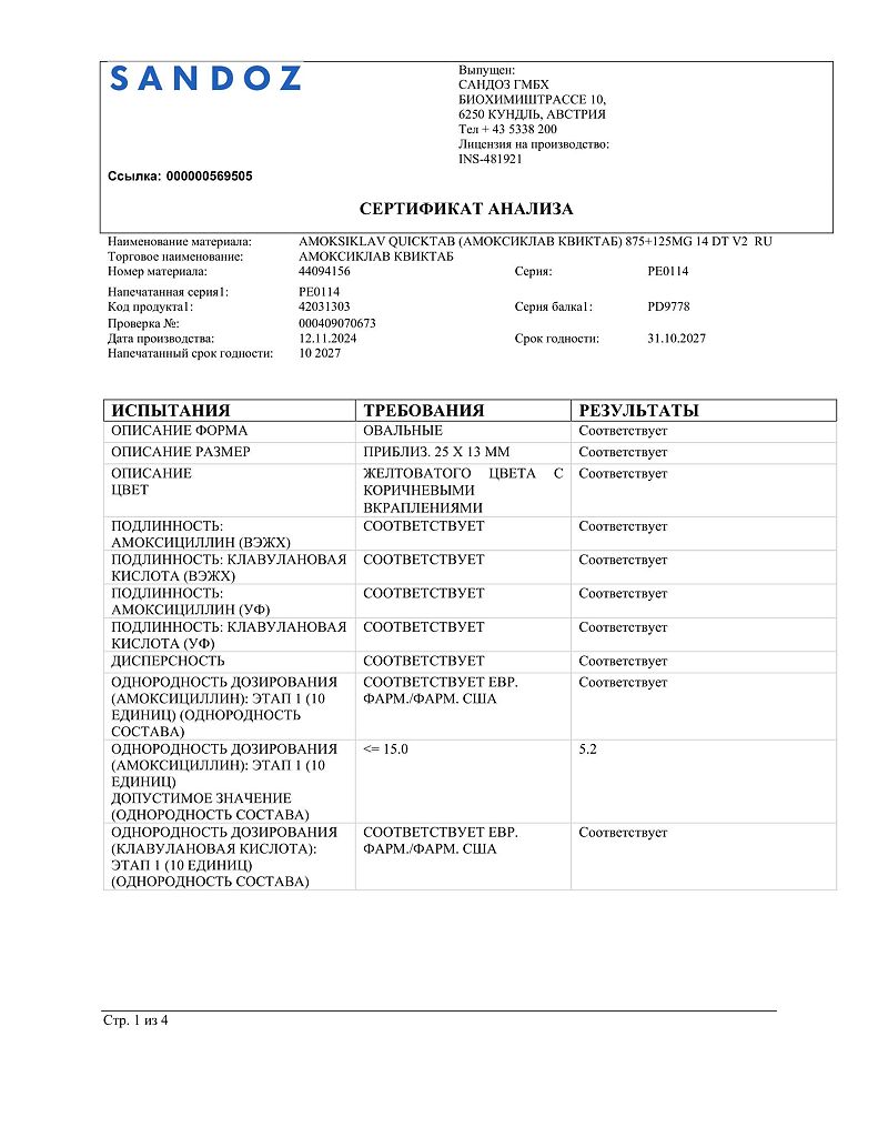 Документы Амоксиклав Квиктаб таблетки диспергируемые 875 мг+125 мг 14 шт