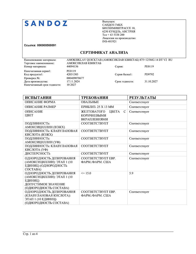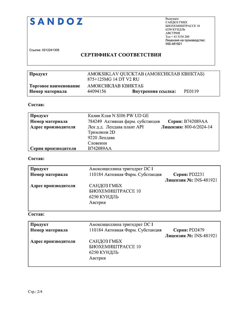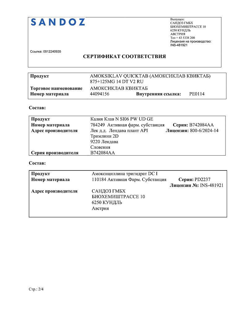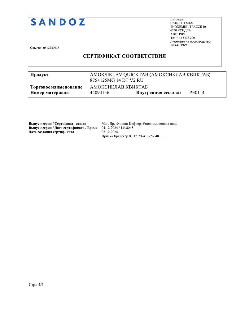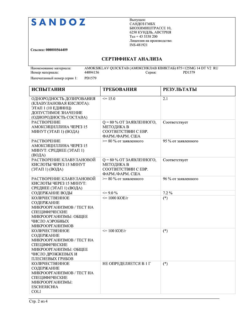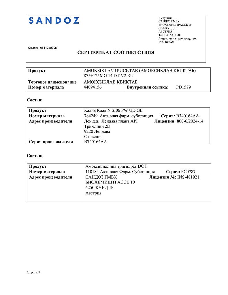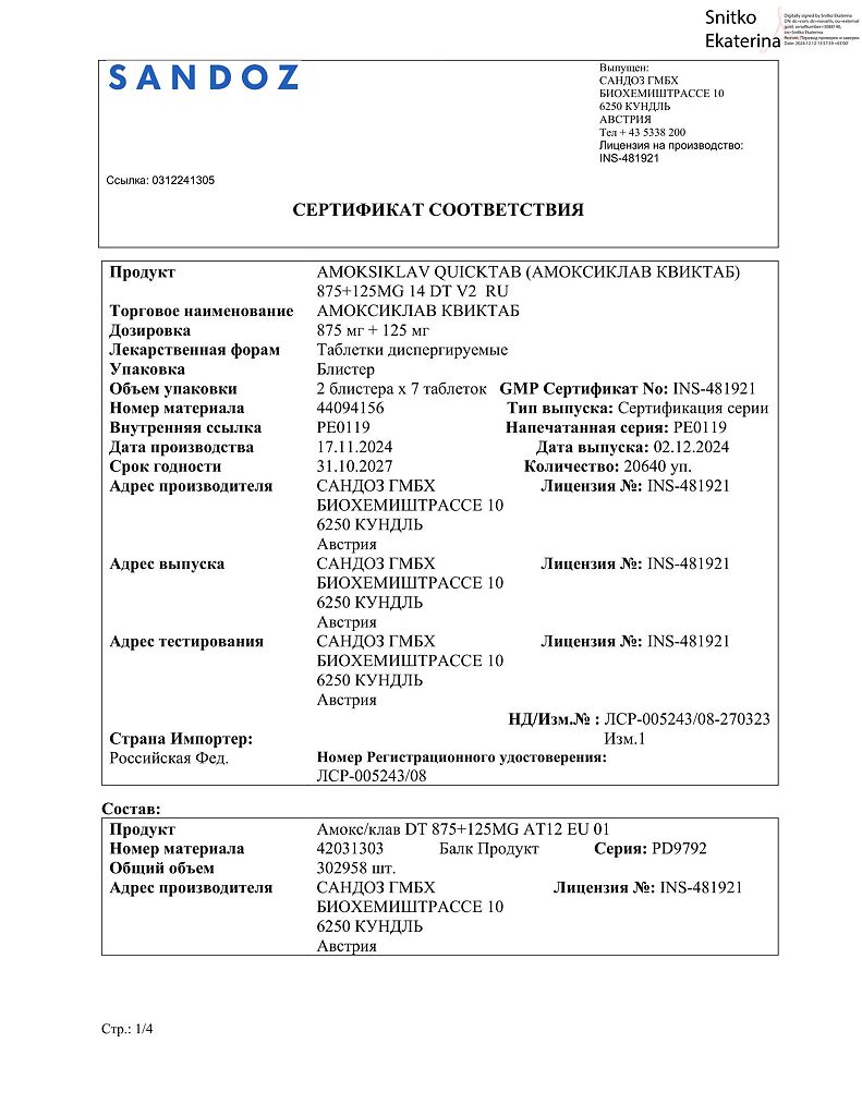 Документы Амоксиклав Квиктаб таблетки диспергируемые 875 мг+125 мг 14 шт