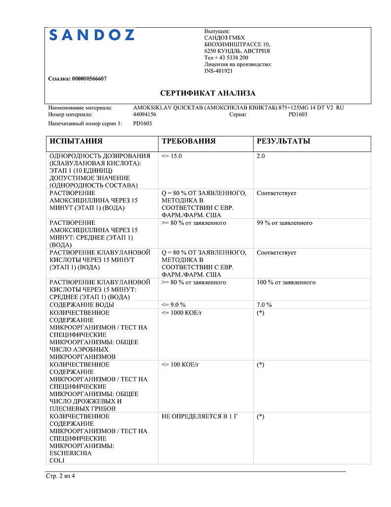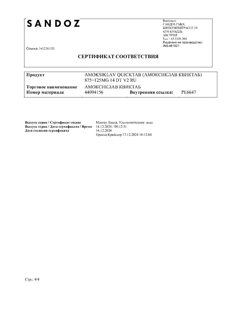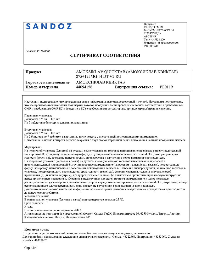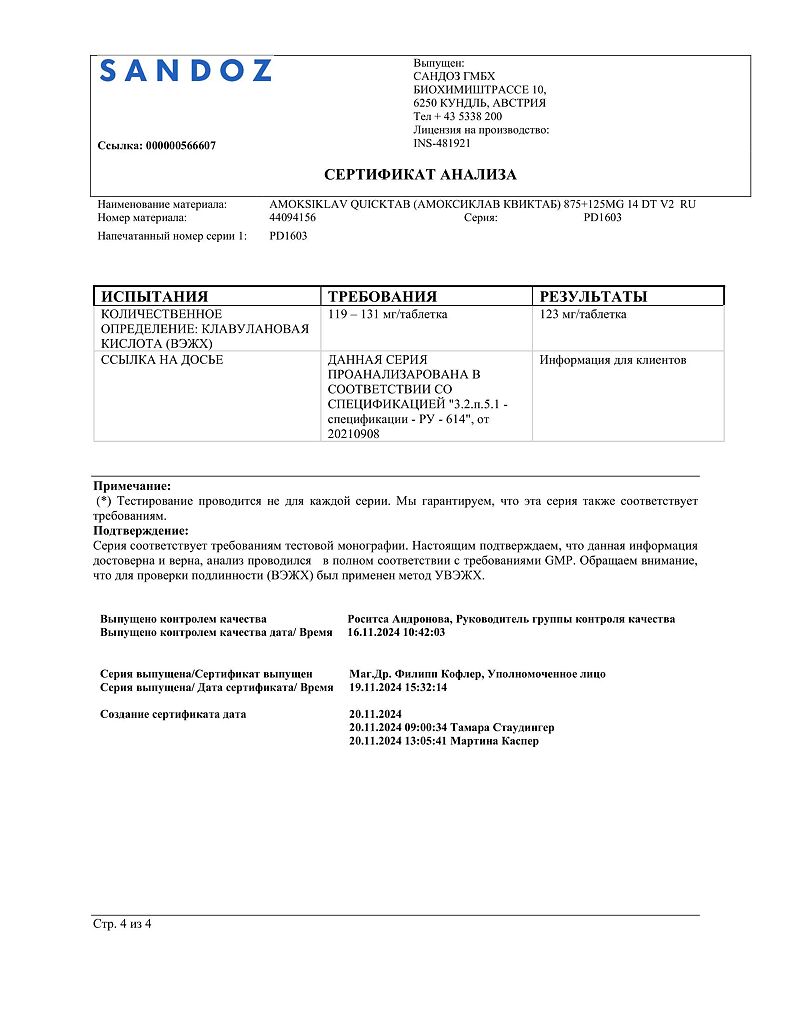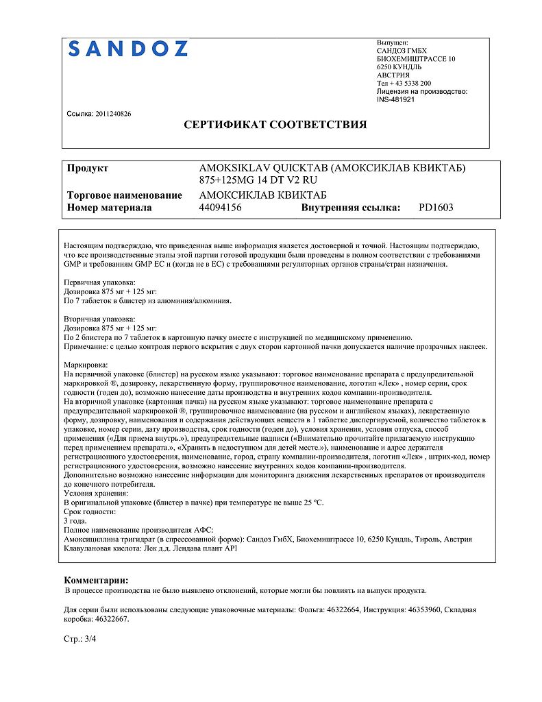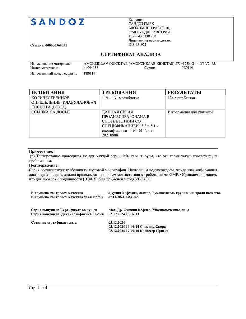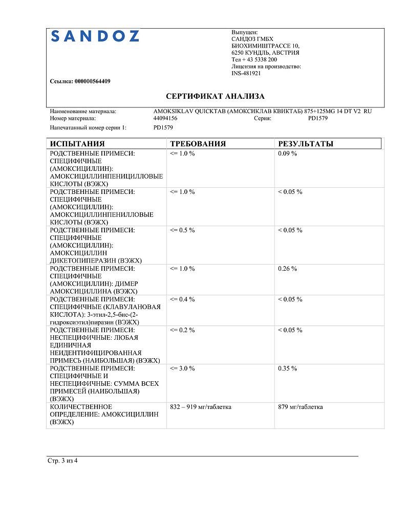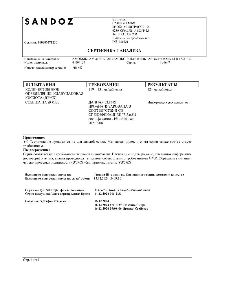 Документы Амоксиклав Квиктаб таблетки диспергируемые 875 мг+125 мг 14 шт