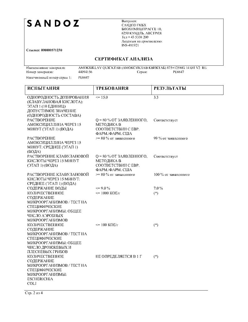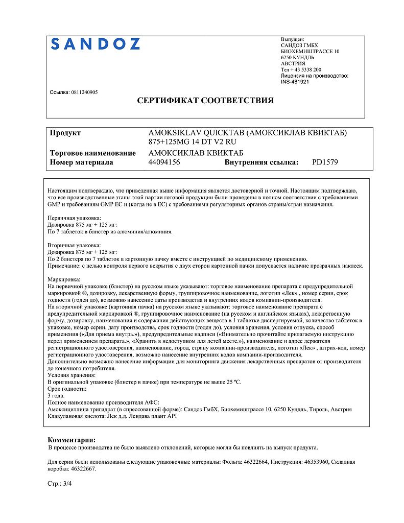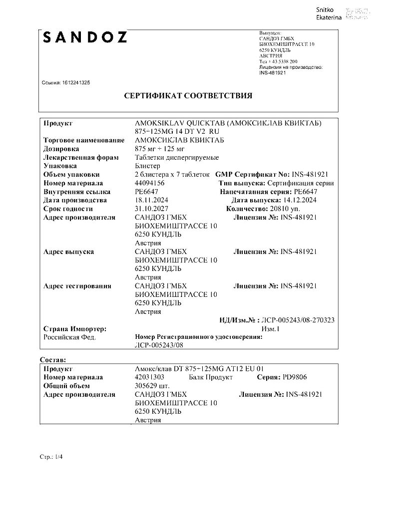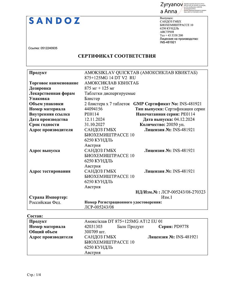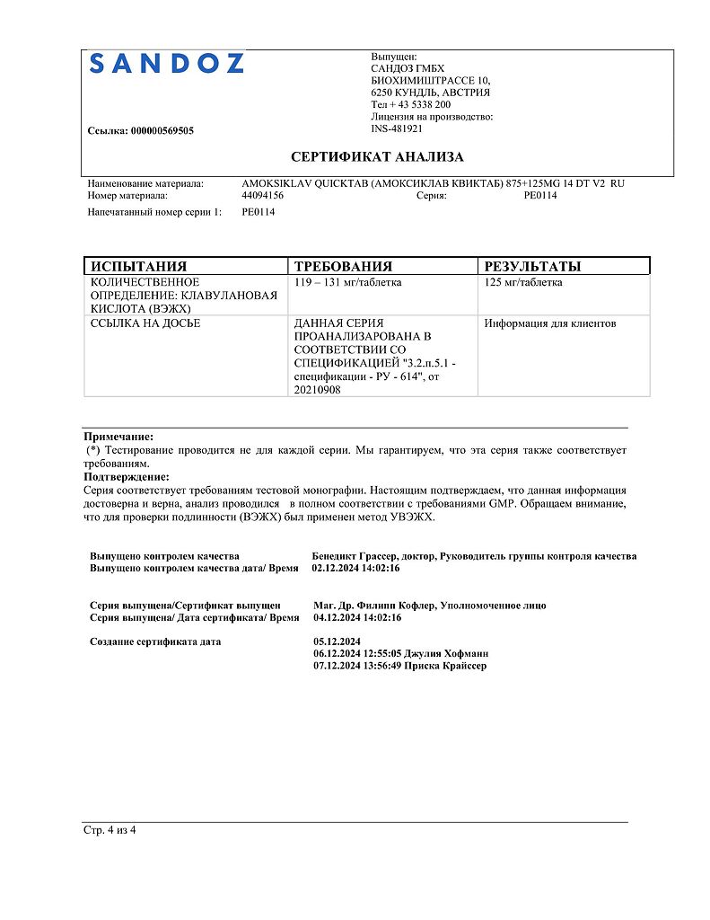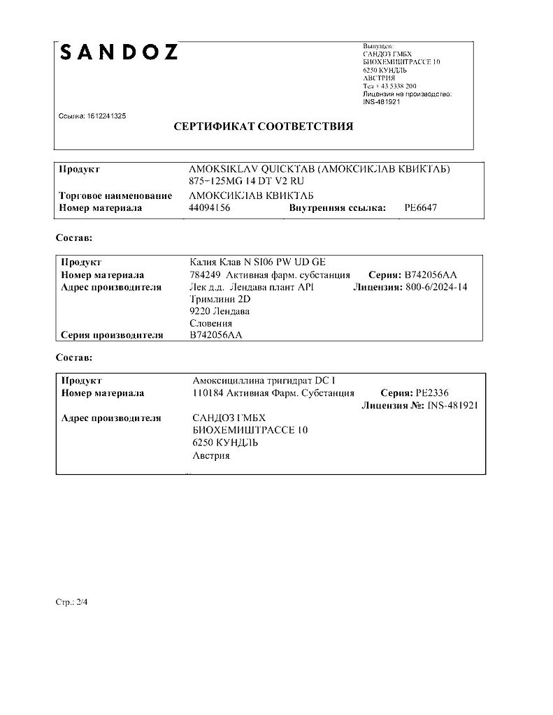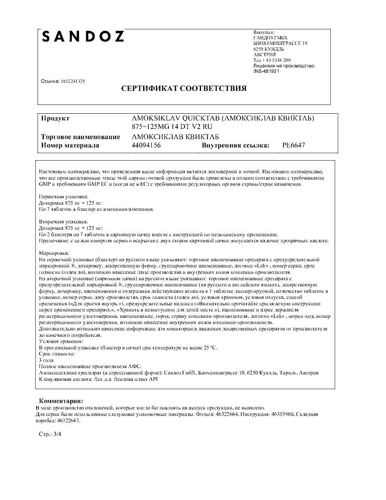 Документы Амоксиклав Квиктаб таблетки диспергируемые 875 мг+125 мг 14 шт