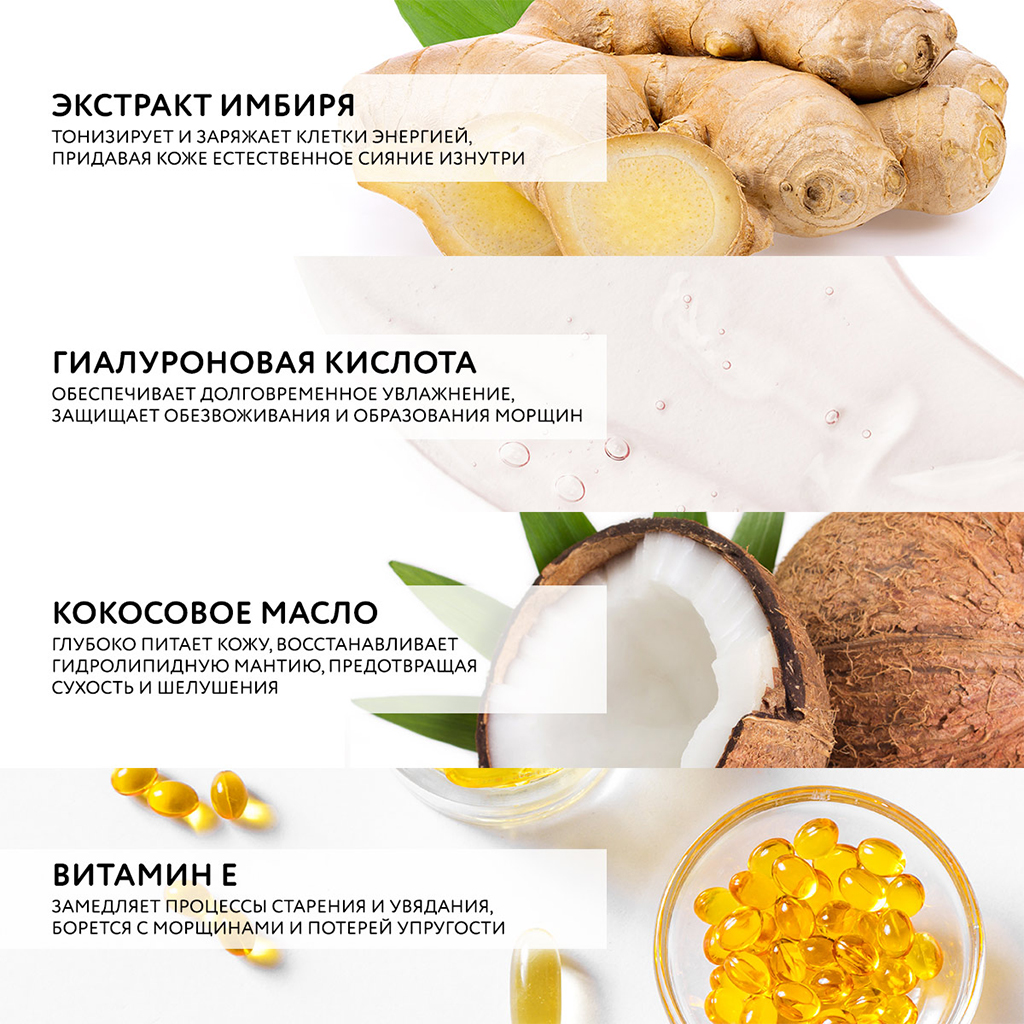 Water, Avocado (Persea Gratissima) Oil, Hydrolyzed Collagen, Cetyl Alcohol, Hyaluronic Acid, Coconut (Cocos Nucifera) Oil, Ginger (Zingiber officinale) Root Extract, Olive (Olea europaea) Oil,Stearic Acid, Progeline (Trifluoroacetyl Tripeptide-2), Almond(PrunusAmigdalus Dulcis) Oil, Caprylic/Capric Triglyceride, Lanolin, Glyceryl Stearate SE, Ceteareth-25 , Glycerin, Quince (Pyrus cydonia) Fruit Extract, Passion Flora (Passiflora incarnate) Leaf Extract, Cucumber (Cucumis sativus) Extract, Shea (Butyrospermum Parkii) Butter, Bees Wax (Cera alba), Benzyl Alcohol, Green Tea Extract, Retinol (microcapsulated), Dimethicone, Polysorbate 20, Adipofillin® ( Aqua (and) Propanediol (and) Ornithine (and) Phospholipids (and) Glycolipids, Pomegranate (Punica granatum) Fruit Extract, Jojoba (Simmondsia chinensis) Oil, Tocopherol, Titanium Dioxide, Carbomer, Horse Chestnut (Castanea sativa) Extract, Disodium EDTA, Salicylic Acid, Cyclomethicone, Fragrance, Xantan (Xanthomonas campestris) Gum, Dead Sea Salt, Sorbic Acid