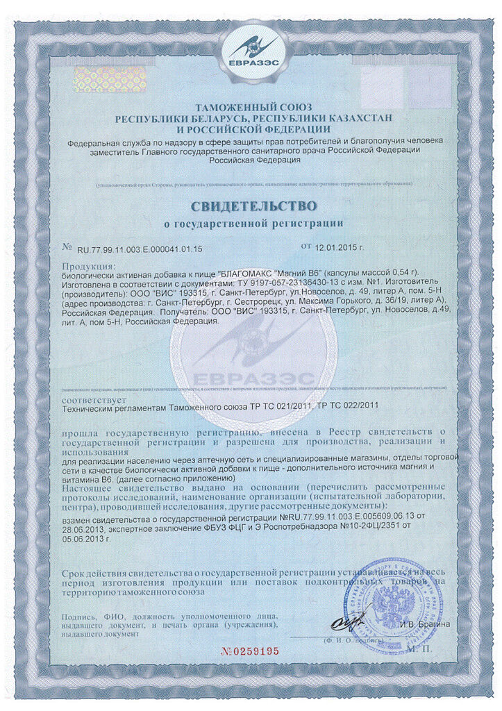 Документы Благомакс Магний В6 капсулы массой 0,54 мг 30 шт