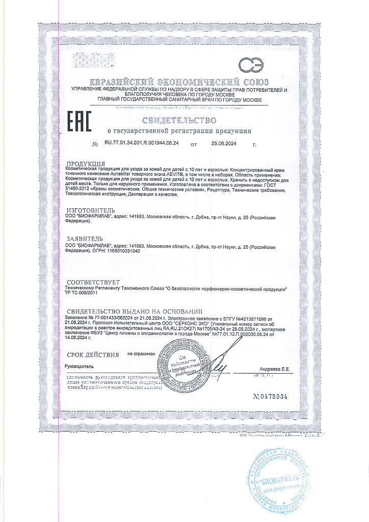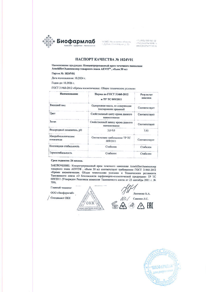 Документы Aevit Acnekiller Концентрированный крем точечного нанесения 10+ 30 мл 1 шт