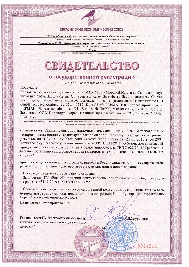 Документы Макслер Морской коллаген Скинкэар вкус клубники / Marine Collagen SkinCare Strawberry flavor фл 500 мл 1 шт