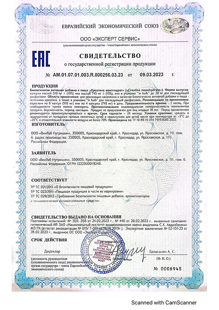 Документы 1WIN Креатина моногидрат / Creatinе monohydrate капсулы массой 510 мг 240 шт
