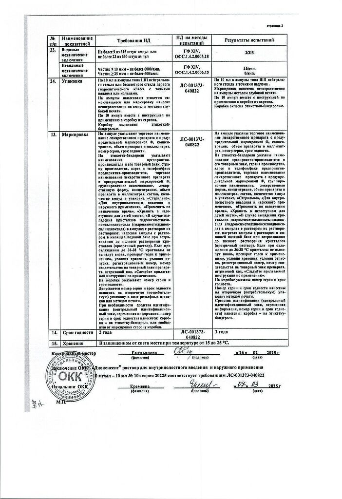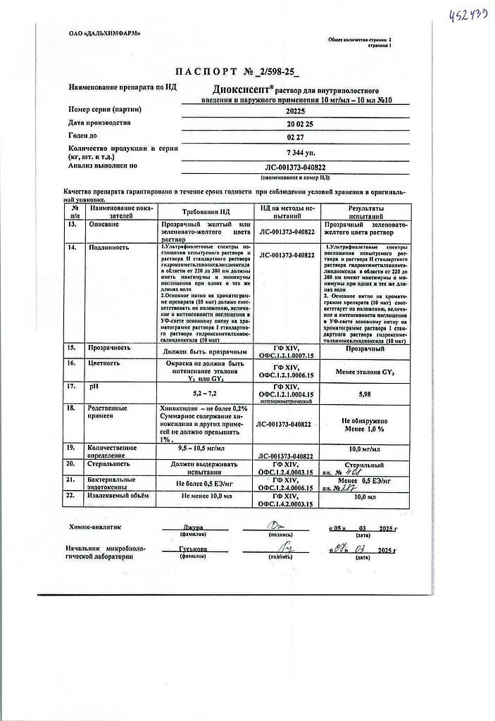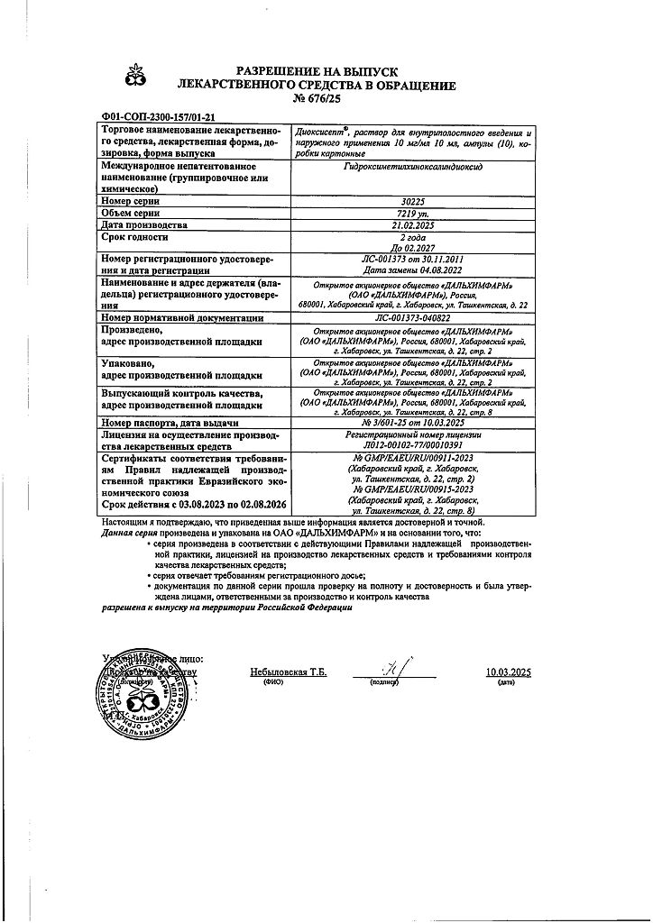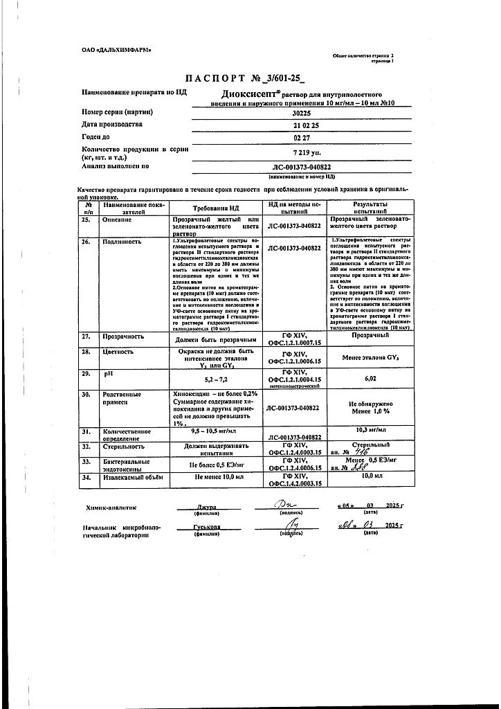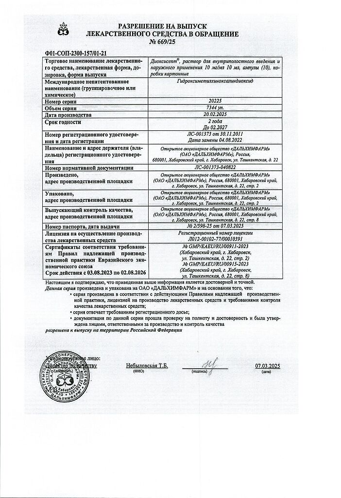 Документы Диоксисепт раствор для в/полост введ и наруж прим 1 % 10 мл 10 шт