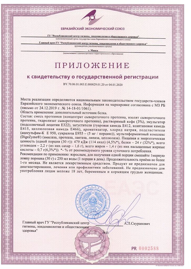 Состав: смесь протеинов (концентрат сывороточного протеина, изолят сывороточного протеина, гидролизат сывороточного протеина), растворимый кофе (3,5 %), эмульгатор (подсолнечный лецитин), загустители (гуаровая камедь, ксантановая камедь, целлюлозная камедь), ароматизатор, хлорид натрия, подсластители (ацесульфам-к, сукралоза), мультиферментный комплекс Digezyme® (амилаза, протеаза, лактаза, липаза, целлюлаза).