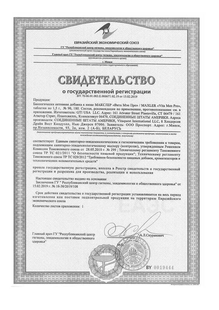 Документы Макслер Вита Мэн Про / Maxler Vita Men Pro таблетки по 1,5 г 180 шт