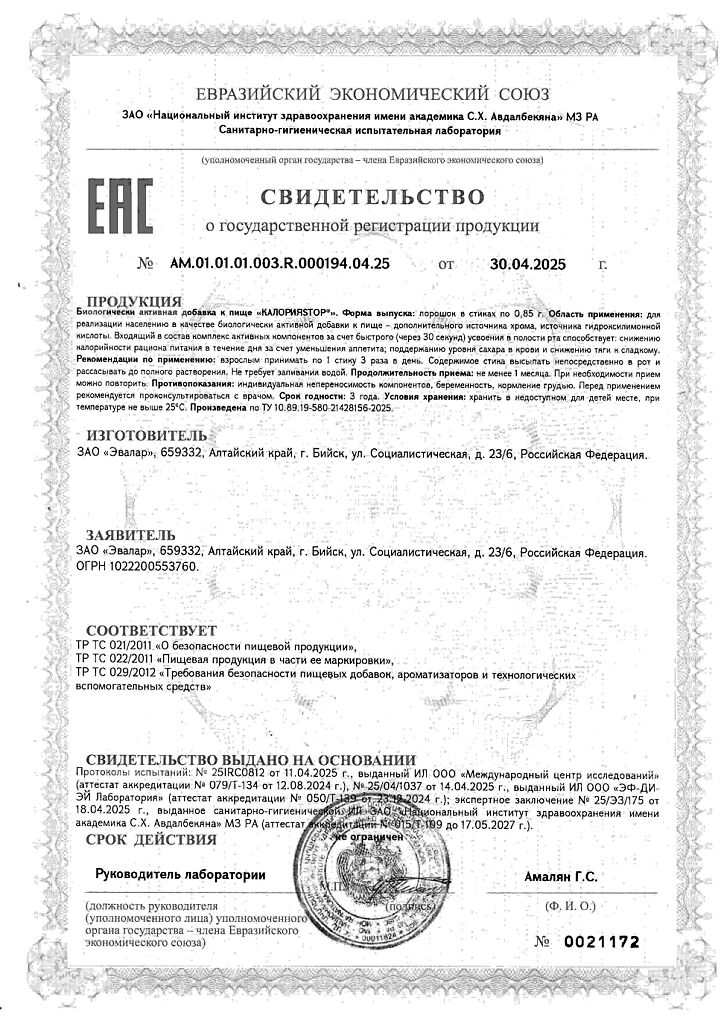 Документы КалорияStop порошок в стиках по 0,85 г 30 шт