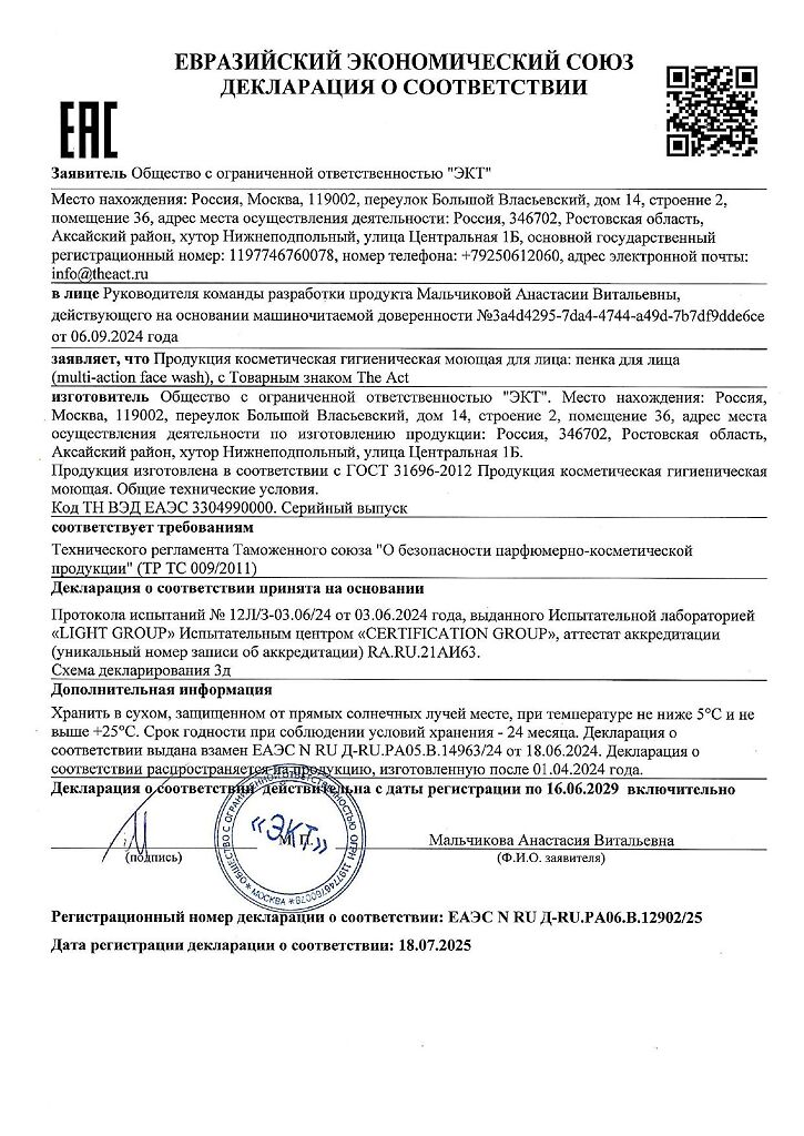 Документы The Act Универсальная крем-пенка для умывания с вытяжкой сосны 100 мл 1 шт
