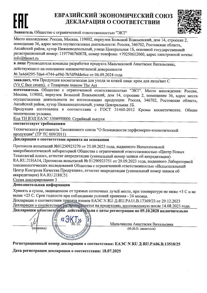 Документы The Act Универсальный крем для лица витамин С 65 мл 1 шт