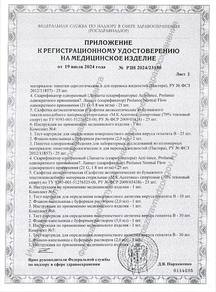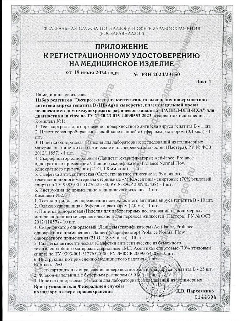 Документы Экспресс-тест для выявления поверхностного антигена вируса гепатита B (HBsAg) набор реагентов РАПИД-ВГB-ИХА комплект №1 1 шт