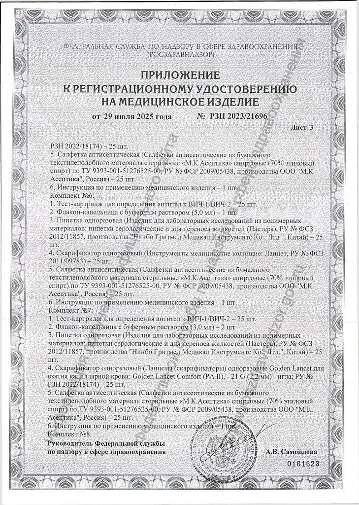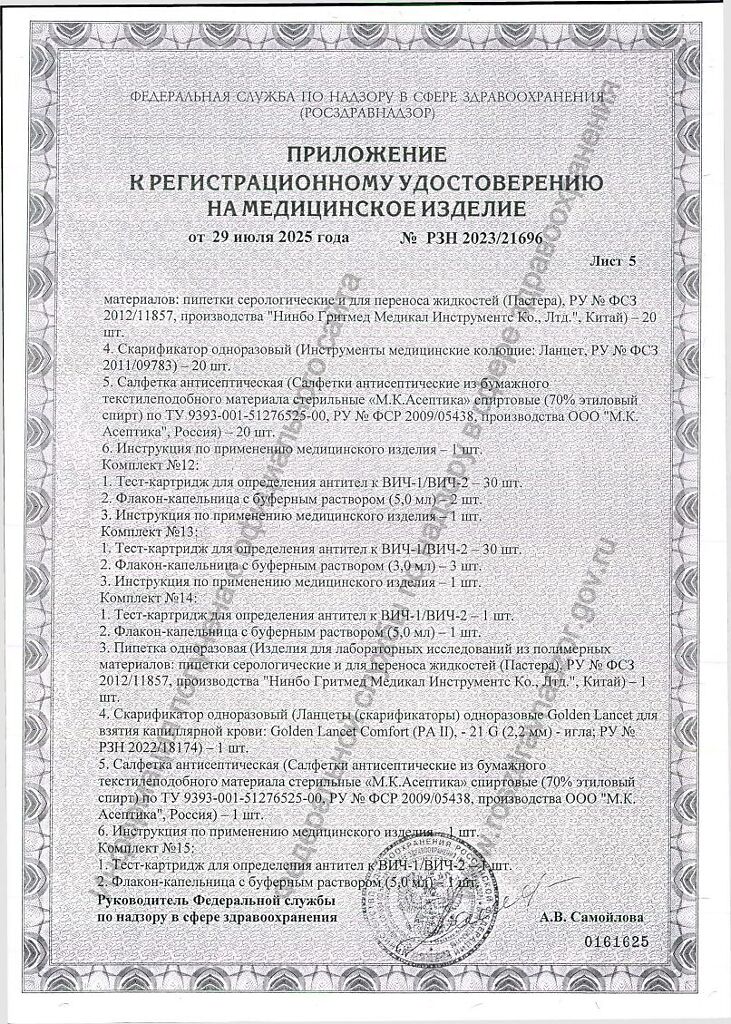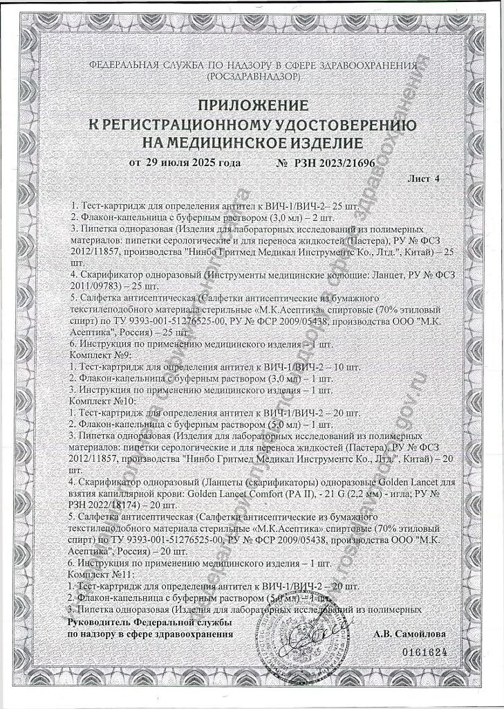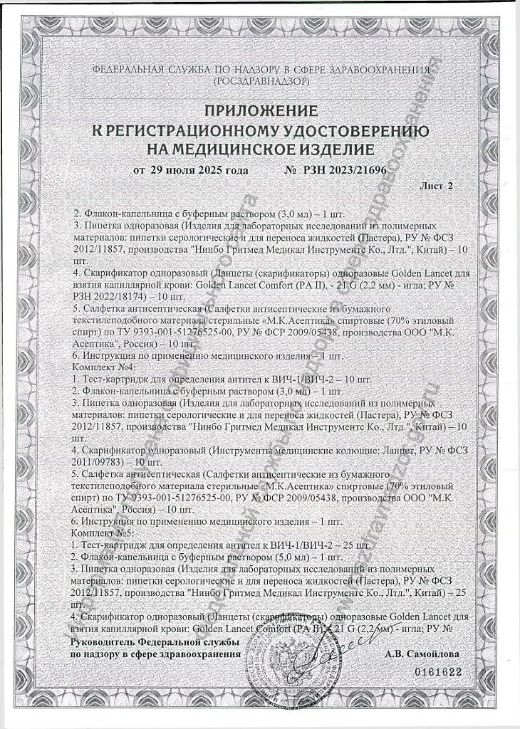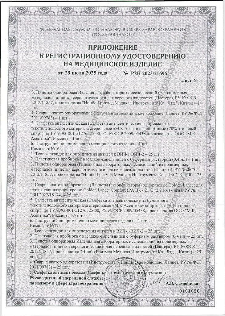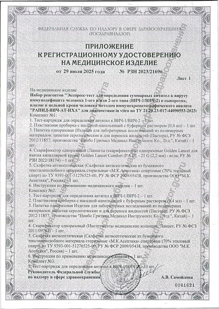 Документы Экспресс-тест для определения суммарных антител к вирусу иммунодефицита человека 1-го и/или 2-го типа (ВИЧ-1/ВИЧ-2) набор реагентов РАПИД-ВИЧ-АТ-ИХА 1 шт