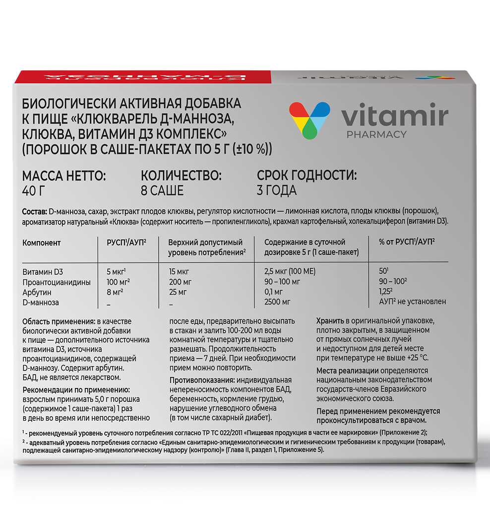 • 📒 Подробная инструкция по применению Витамир Клюкварель Д-манноза, клюква, витамин Д3 комплекс порошок в саше-пакетах по 5 г 8 шт