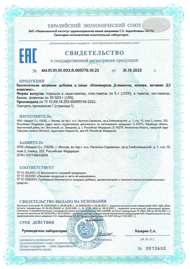 Документы Витамир Клюкварель Д-манноза, клюква, витамин Д3 комплекс порошок в саше-пакетах по 5 г 8 шт
