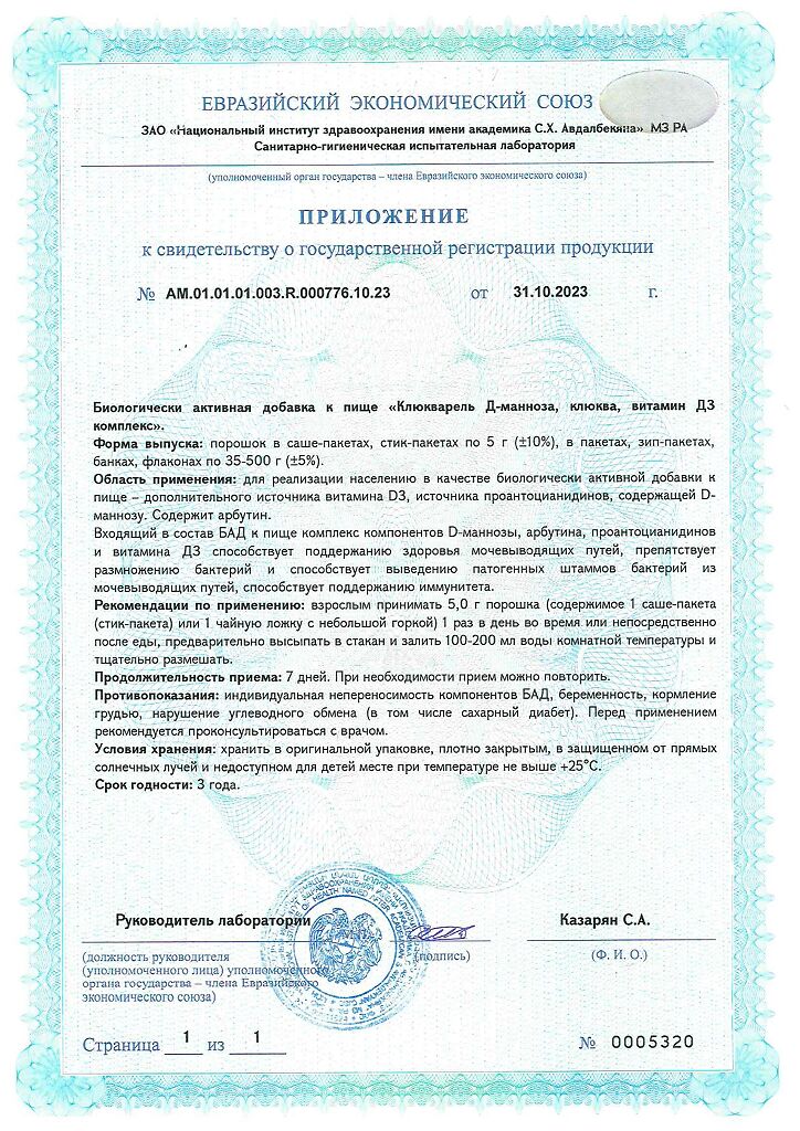 В качестве биологически активной добавки к пище — дополнительного источника витамина D3, источника проантоцианидинов, содержащей D-маннозу. Содержит арбутин. Входящий в состав БАД к пище комплекс компонентов D-маннозы, арбутина, проантоцианидинов и витамина Д3 способствует поддержанию здоровья мочевыводящих путей, препятствует размножению бактерий и способствует выведению патогенных штаммов бактерий из мочевыводящих путей, способствует поддержанию иммунитета. БАД, не является лекарством.