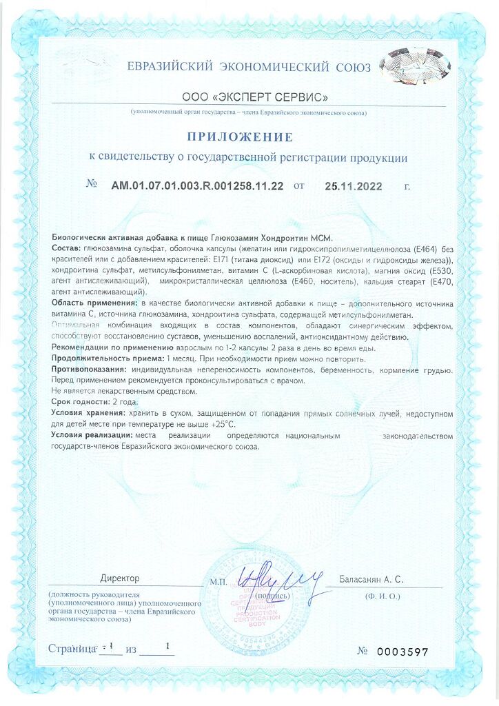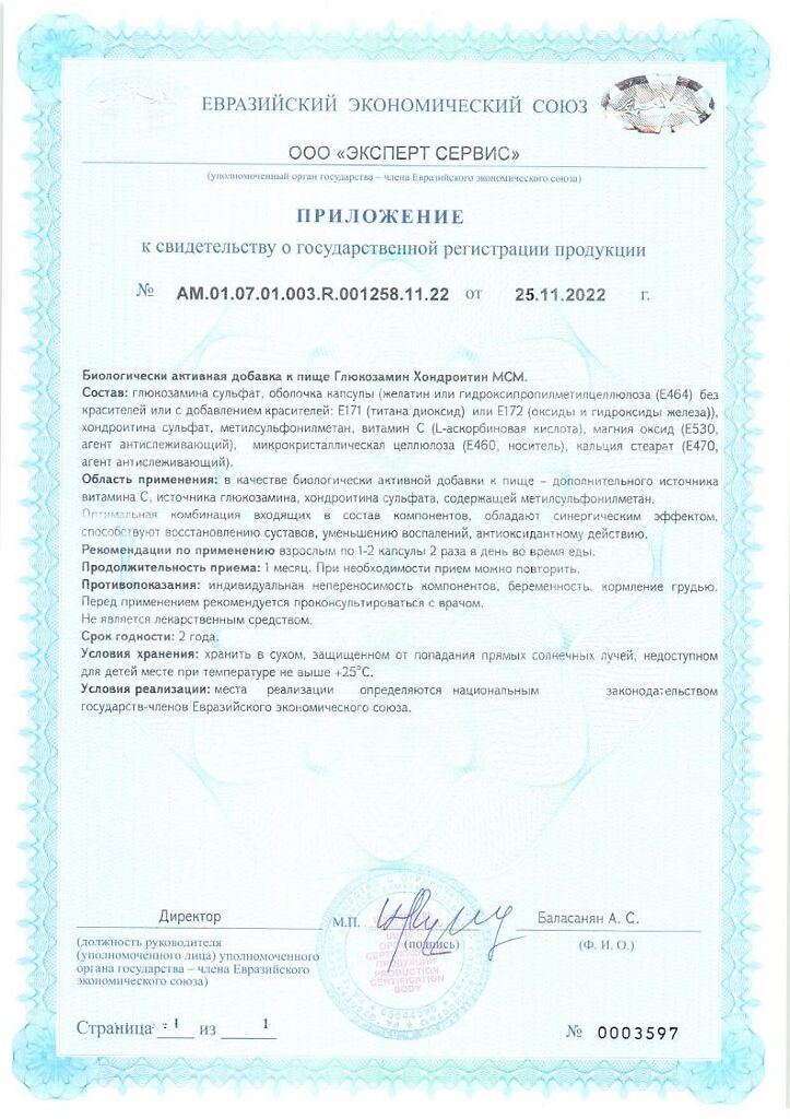 Состав Глюкозамина сульфат, оболочка капсулы (желатин, краситель: диоксид титана), хондроитина сульфат, метилсульфонилметан, витамин С (L-аскорбиновая кислота), магния оксид (агент антислеживающий),  микрокристаллическая целлюлоза (носитель), кальция стеарат (агент антислеживающий).