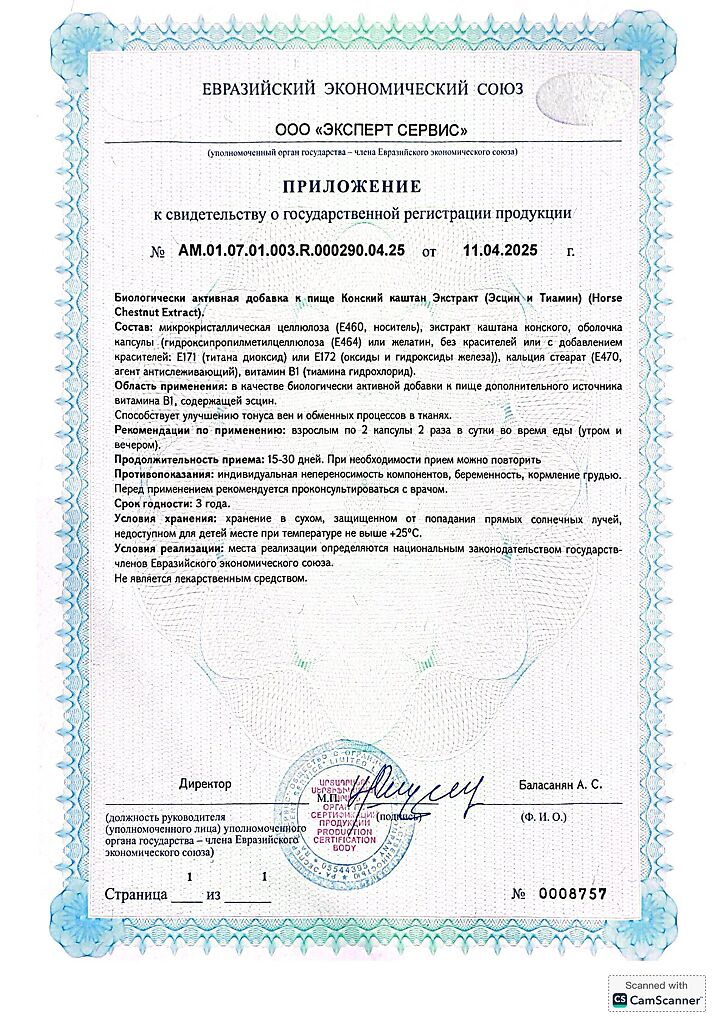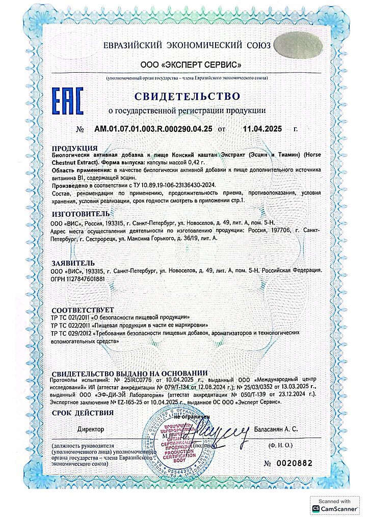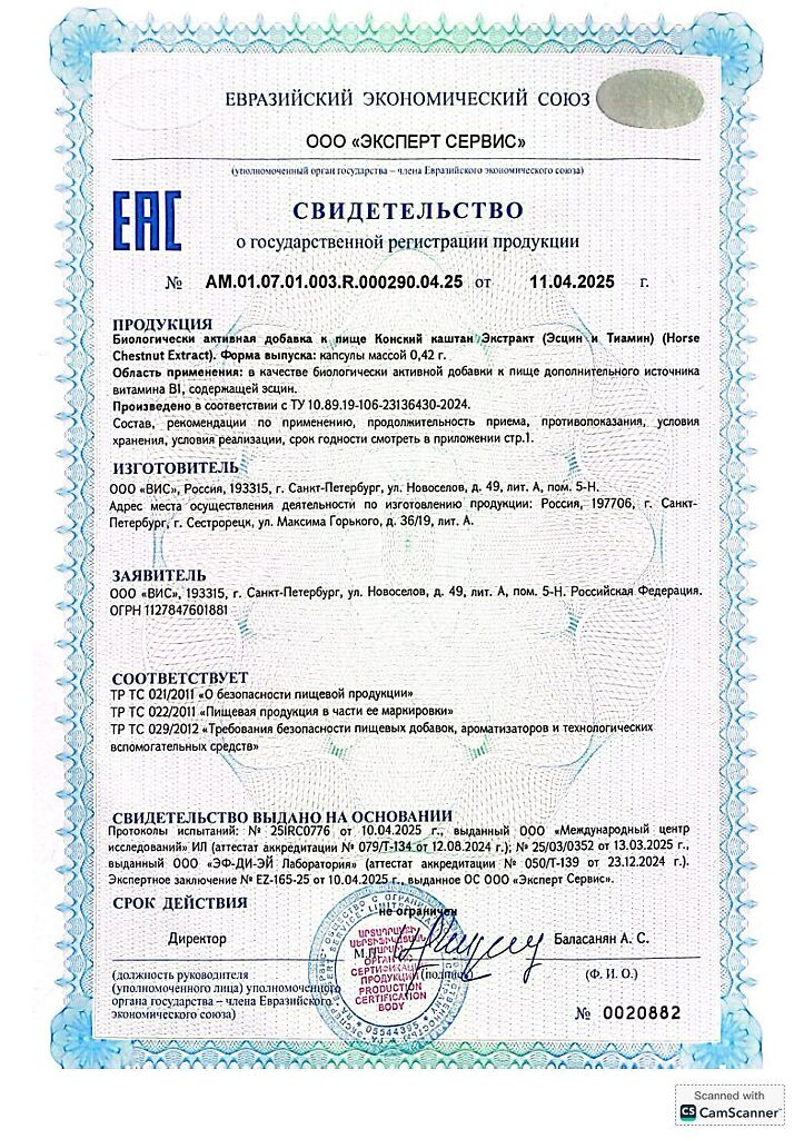 Документы Конский каштан экстракт ВИС (Эсцин и Тиамин) /Horse Chestnut Extract) капсулы массой 0,42 г 30 шт