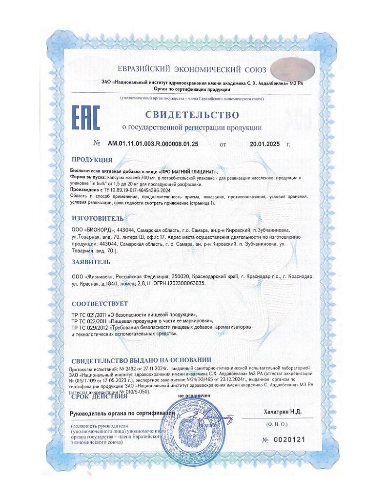 Документы Жизнивек ПРО Магний глицинат капсулы массой 700 мг 60 шт
