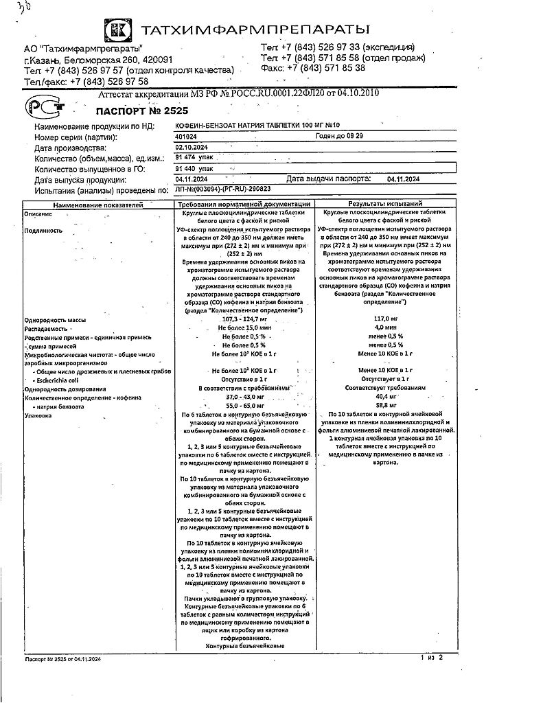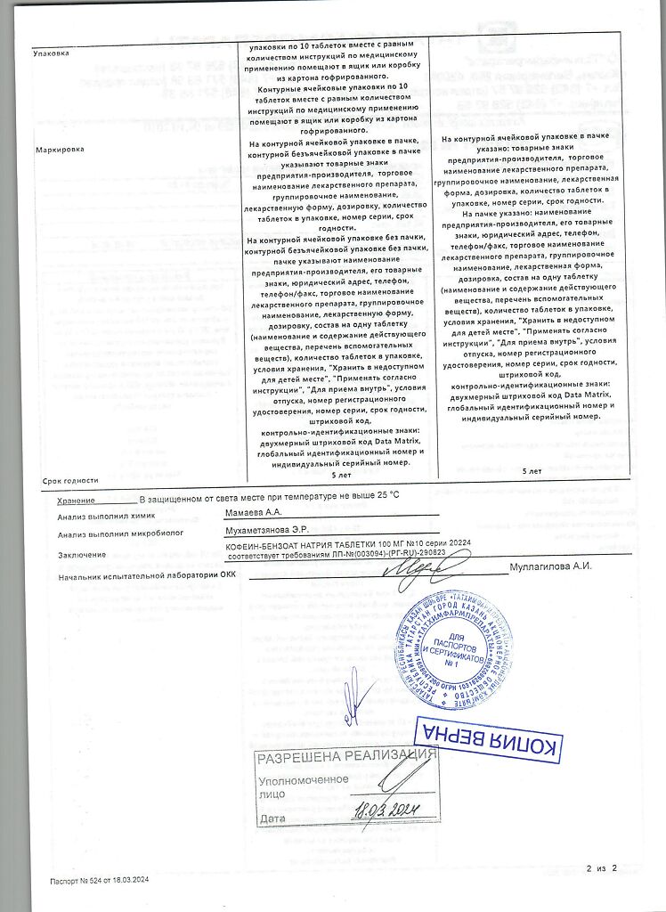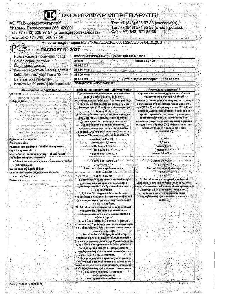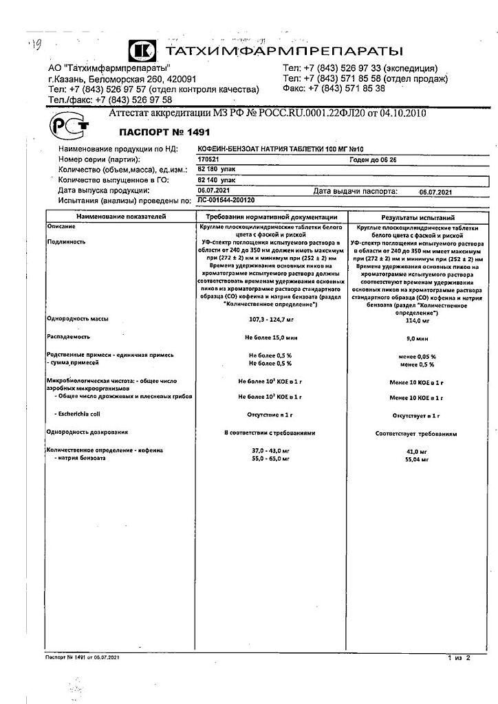 Активное вещество: кофеина-бензоат натрия - 100 мг;
